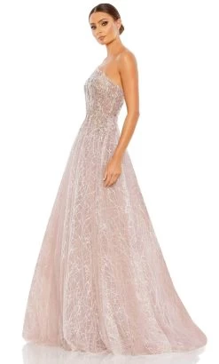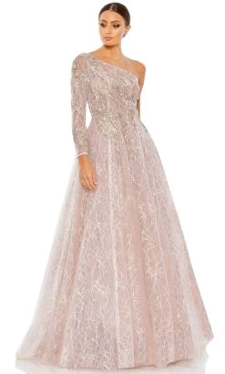 Showcase a fashion sense that flourishes beauty in this Mac Duggal 20232 masterpiece. This gown has a luxurious embellishment of beadwork, embroidery and leaf appliques which gives off a beautiful shine in the light and an attention-grabbing look. It shows off an illusion bodice framed by an asymmetrical neckline, one shoulder long sleeve and a mid-open zippered back. The skirt flares into a beautiful A-line silhouette in a full length hem and ends in a sweep train. This Mac Duggal 20232 creation will let you celebrate that divine feminine beauty! Models are wearing the Champagne and Dusty Rose colors.