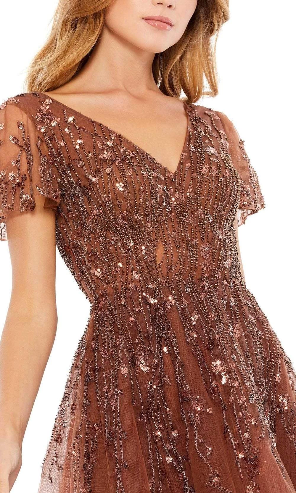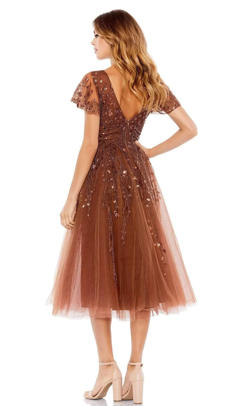 Capture that striking presence and get everyones attention in Mac Duggal Cocktail 20304 dress. Beautifully designed with trailing beaded appliques throughout the bodice, this dress features a V neckline and sheer flutter short sleeves. The V-shaped open back has a zipper closure while an A-line skirt runs at tea length hem. This Mac Duggal design will surely able you to dance all night long.