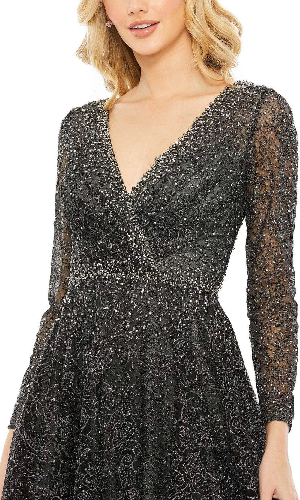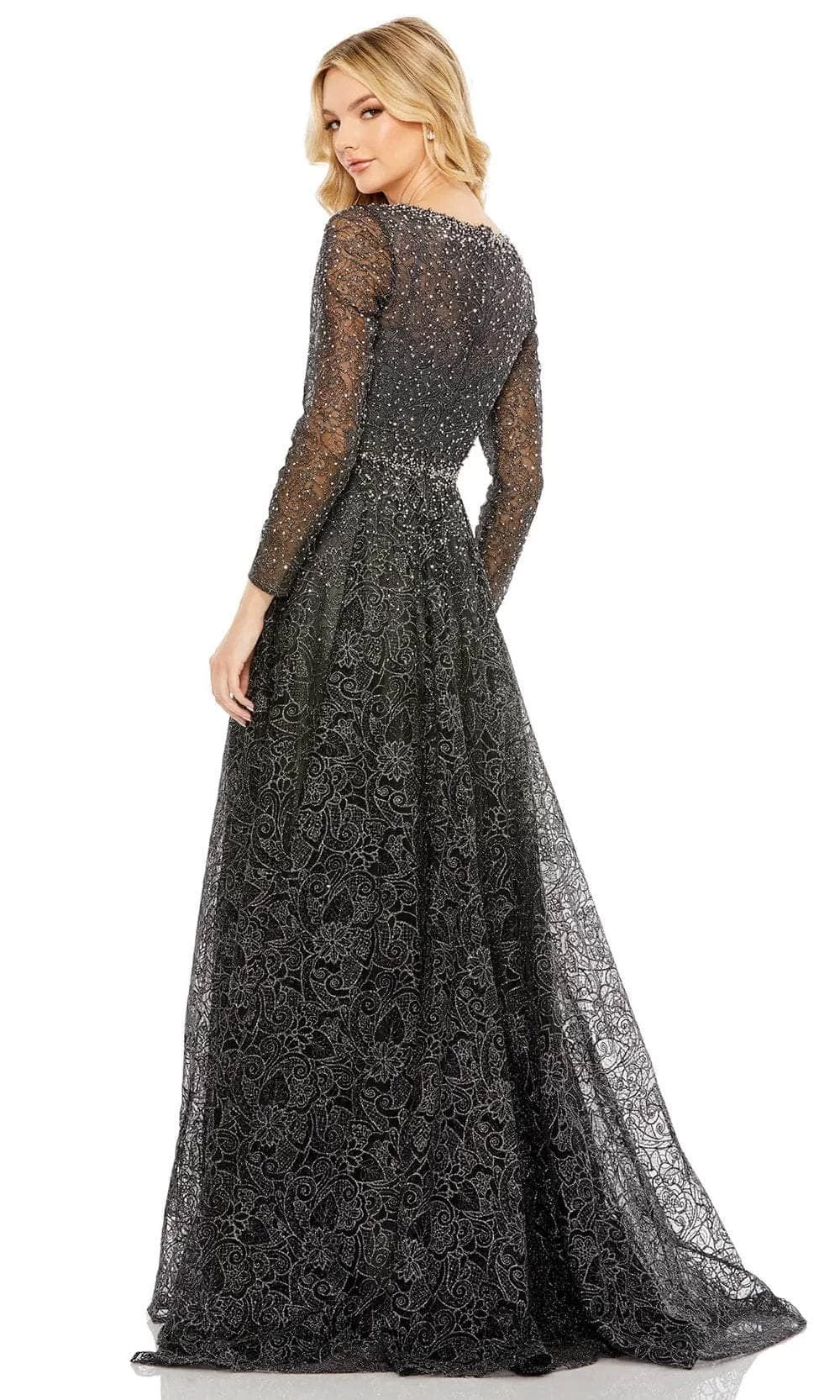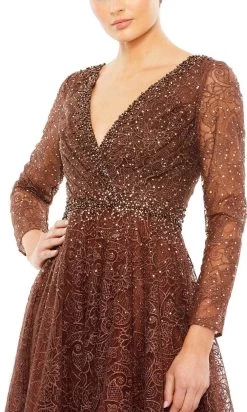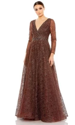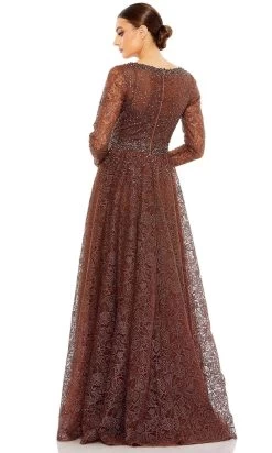 Grace every party with a flair of a diva in this gorgeous Mac Duggal 20372. Flatteringly tailored to flaunt those natural curves, this embellished lace overlay piece features a V-neckline adorned with hand-stitched beaded embellishments on a long sleeve bodice. Defined with a fully enclosed back and accented with beaded detail along the waist, the A-line skirt touches the floor to create a sweeping train. Make them stare at this irresistible Mac Duggal 20372 masterpiece. Models are wearing Graphite and Chocolate colors.