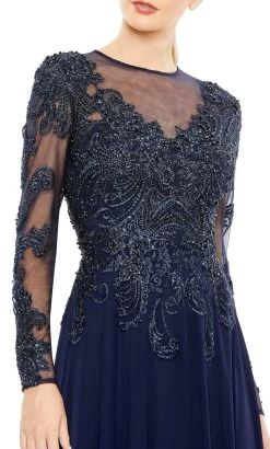 Dazzle in our stunning Mac Duggal 20385 dress, perfect for your next special occasion. This embroidery Fabric dress is a stunning masterpiece that will make you feel like royalty. The intricate beadwork on the bodice and sleeve add a touch of glamour and sophistication, while the illusion neckline and illusion long sleeves create a subtle hint of allure. The chiffon full-length skirt is flowing and light, allowing you to move with grace and elegance. The A-line silhouette and short train add an extra touch of drama to the design. Fully lined for comfort, with a back zipper for easy wear, this dress is perfect for any formal occasion. Be the center of attention in our show-stopping dress by Mac Duggal 20385. Model is wearing the Midnight color.