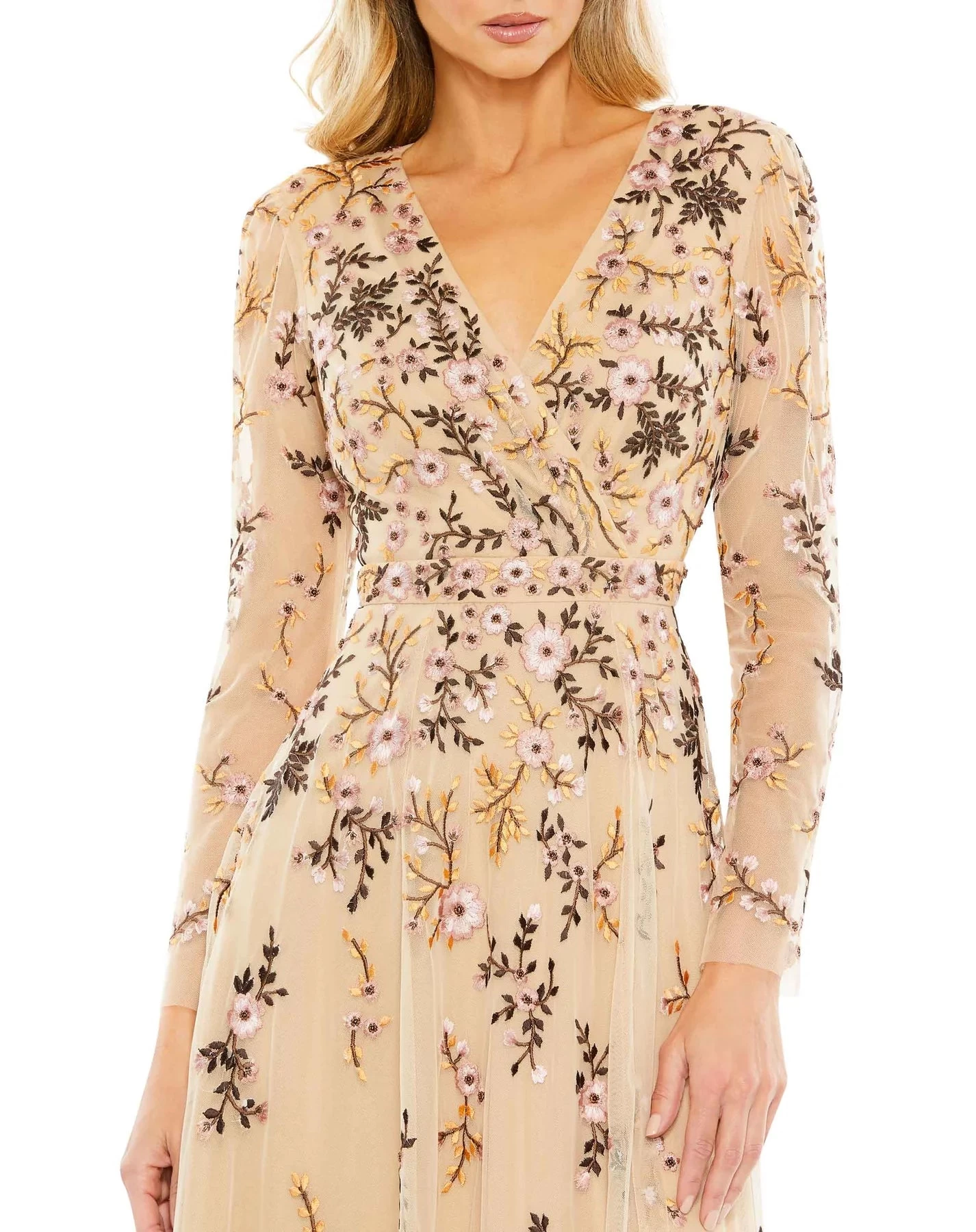 | Details: | V-Neck, Sheer Long Sleeves, Floral Embroidery, Surplice Bodice, Sheer Overlay, Full Back, Back Zipper, Gathered Skirt |