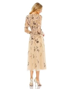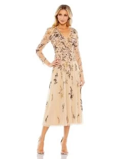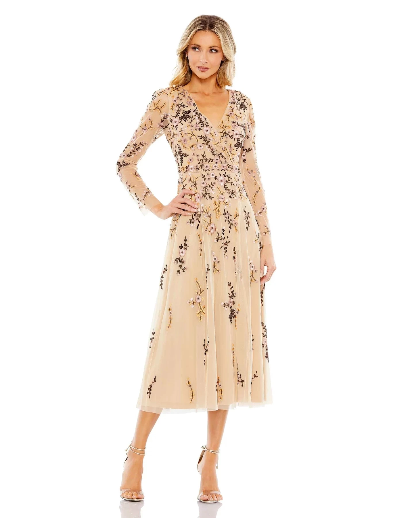 Be the loveliest of them all wearing Mac Duggal Cocktail 35103 dress. Beautifully designed with floral embroidery, this dress showcases a V neckline and sheer long sleeves. The A-line skirt reveals a gathered detail and sheer overlay as it cascades down to tea-length hemline. Be the ultimate belle of the party in this gorgeous creation from Mac Duggal.
