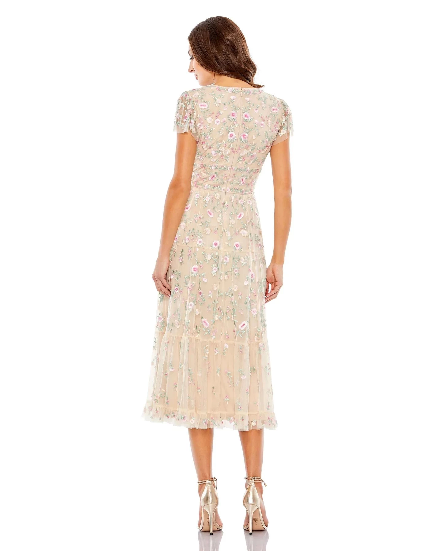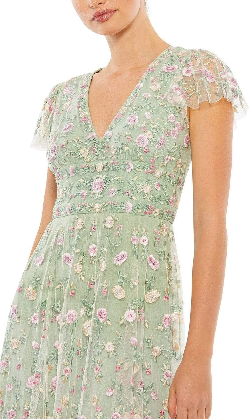 Bloom with loveliness in this floral dress from Mac Duggal Cocktail 35104. This dress is crafted with floral embroidery that adorns the bodice framed with a deep V-neckline and sheer ruffled butterfly sleeves. The full back is secured with a center zipper closure. Nipped with an empire waistband, the sheath skirt reveals a tea length hemline with ruffled tiered detail. This Mac Duggal creation is perfect on your next formal event!
