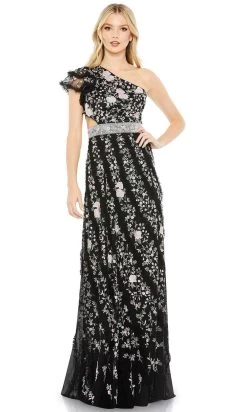 Turn yourself into a head-turning beauty by slipping into this absolutely eye-catching Mac Duggal 35108 creation. Intricately detailed with floral embroidery, the dress displays an asymmetric neckline and one-shoulder short sleeve with a ruffle design. The waist highlights a side cutout and a beaded wide waistband which makes your look more glamorous. While the open back reveals an asymmetric strappy lace-up tie and the sheath skirt gracefully cascades into a full-length hemline. This Mac Duggal style is a sure standout on your next evening social event. Models are wearing the Black/Multi and Ivory colors.