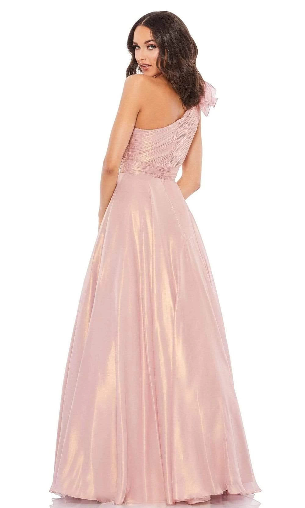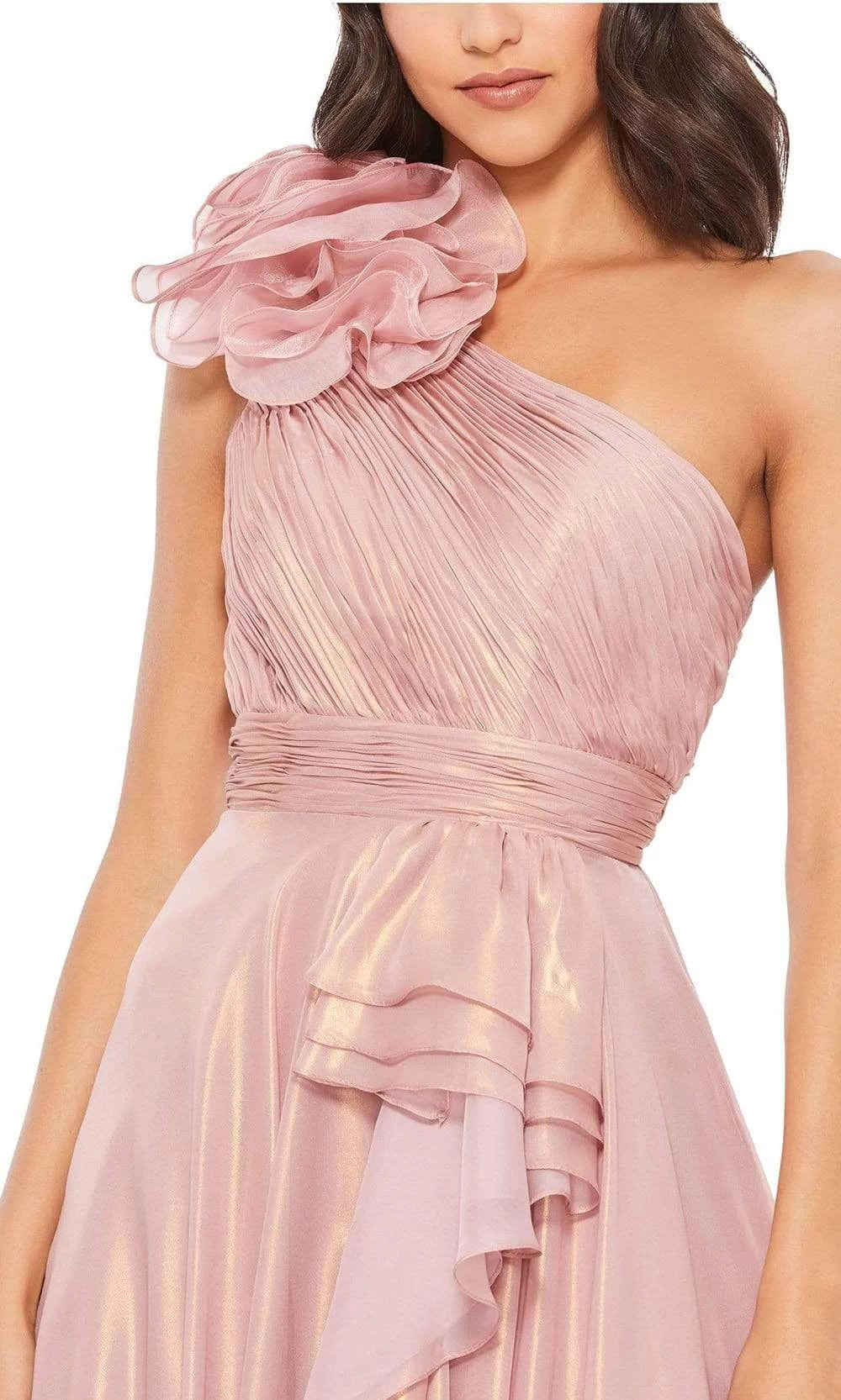 Lavish in the sophisticated beauty of this Mac Duggal 49252 creation. Adorned with a stunning floral applique gracing the one shoulder bodice, this stunner has a shirr-styled design. Wrapped with a ruche-ornate waistband and accented with a ruffle trim, the skirt flares into a floor length hemline. Be hailed as a total stunner in this Mac Duggal masterpiece.