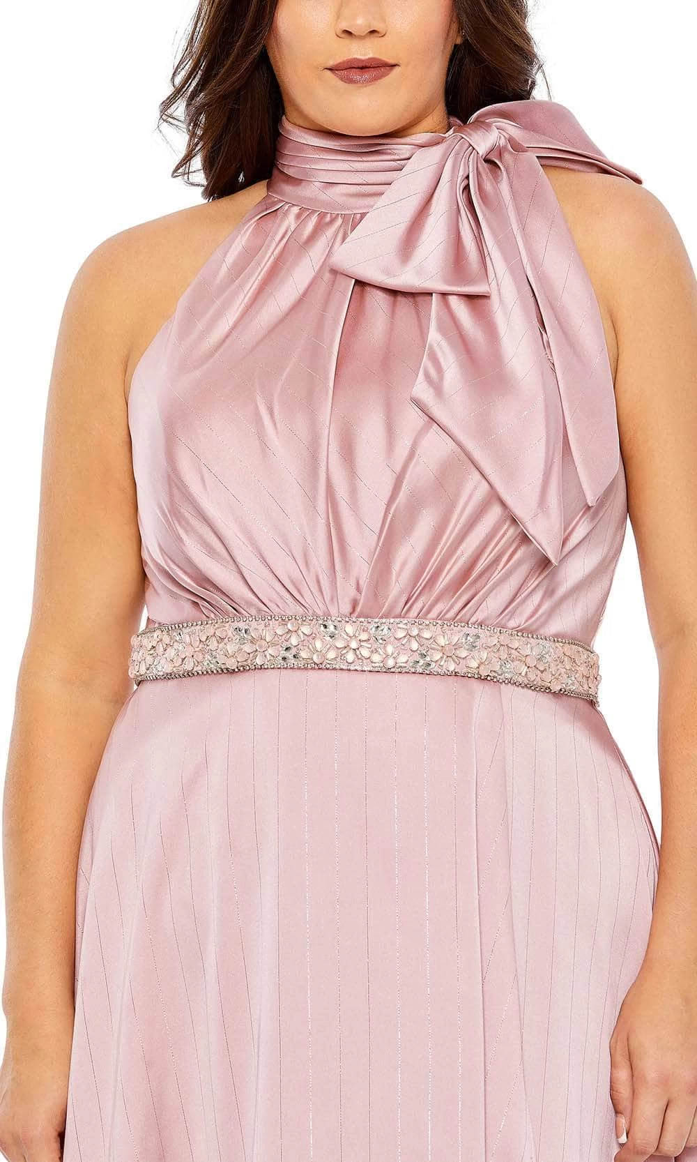 Show up in this beautiful Mac Duggal 49578 that has the perfect amount of glitz and glamour. Styled in pleated and ruching details, this sleeveless stunner boasts a halter neckline with an accent bow and a full back with zipper closure. Sparkling waistband accentuates the curves while the skirt gracefully flows down a floor length hem in wrap around style that shows a bit of skin in front. Charm everyone from all angles as you shine all night long in this Mac Duggal masterpiece.  Model is wearing the Fuchsia color.