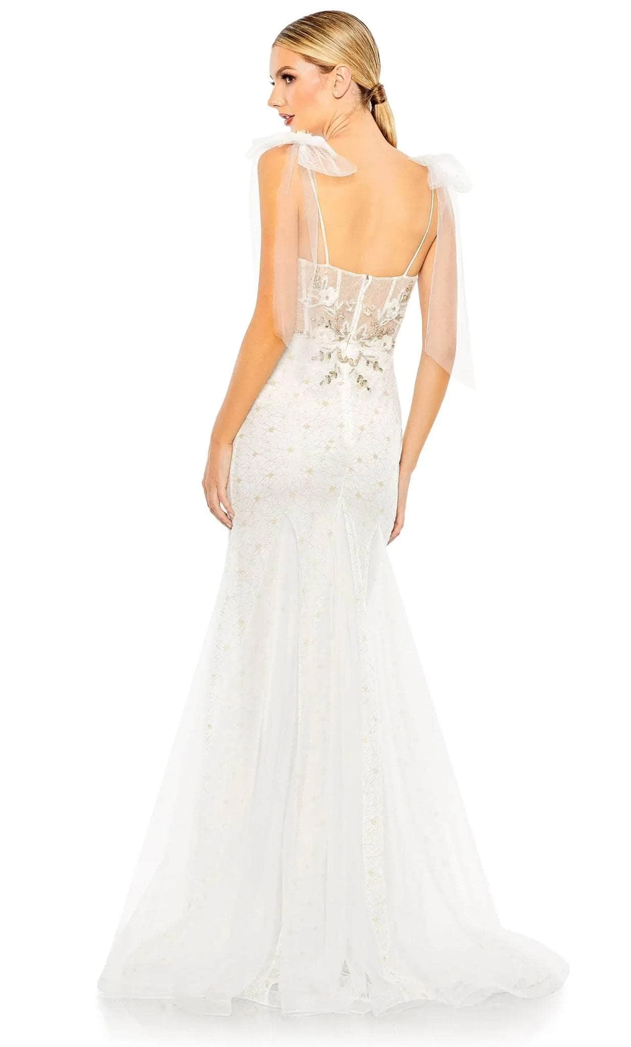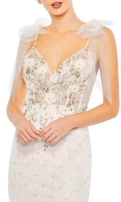 Bring forth your inner fashionista with this absolutely flawless design by Mac Duggal 50666. This lovely dress is a stunner thanks to its exquisite tailoring and luxurious fabric detailed with rhinestone-dotted shoulder bows and botanical embroidery. Features a V-neckline supported by two and corset boned bodice. The zipper at the back ensures a smooth and comfortable fit, while the trumpet silhouette highlights your curvy figure. This dress, with its modest train, will leave them speechless. Show off your style with this magnificent creation by Mac Duggal 50666. Model is wearing the White/Gold color.