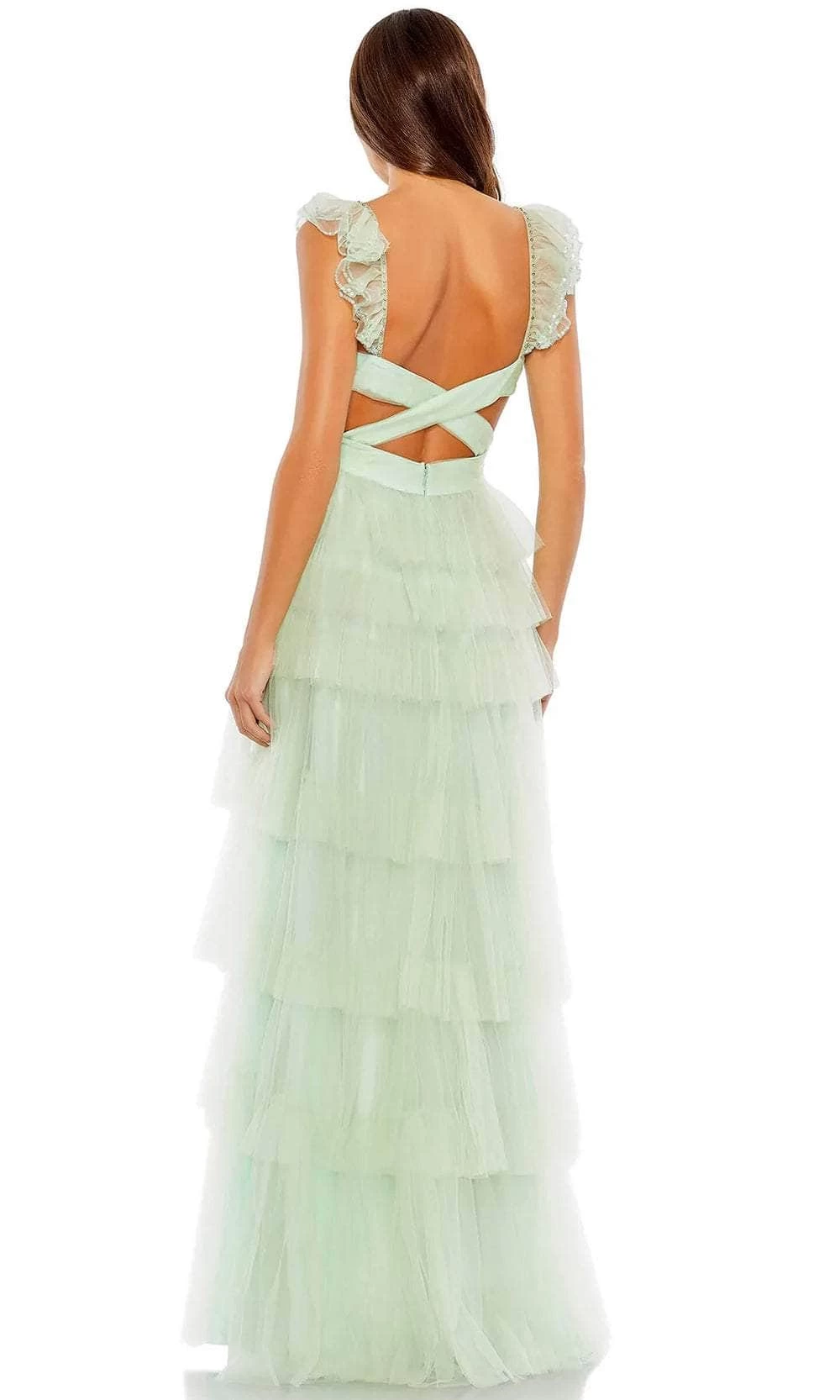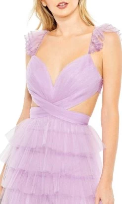 Enter the hall with grace and beauty in this Mac Duggal 50670. This breathtaking dress is tailored from tulle fabric and features a bodice that has a plunging sweetheart neckline framed with cap sleeves and perfectly matched with an open back that gorgeously shows off some skin with straps that crisscross gracefully at the back completing the look. The trim ruffled skirt parades in an A-line silhouette and is secured with a zipper closure at the back. A sweep train is added. Flatter those exquisite assets in this Mac Duggal 50670 masterpiece. Models are wearing Mint and Lilac colors.