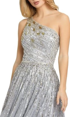 Promote attention-grabbing style in this stunning gown from Mac Duggal 5220. This lavishly embellished gown shows off a sleeveless, asymmetric neckline with a fitted bodice and a back zipper closure. The skirt is tailored in a full length A-line silhouette. This Mac Duggal dress is perfect for any formal evening.