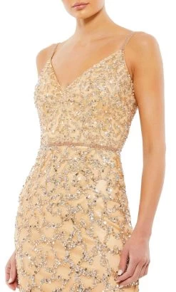 Show off your exceptional style in this stunning creation by Mac Duggal 5481. This beautiful dress has a sleeveless fitted bodice that is embellished with glittering sequins and beads and crowned with a V-neckline. This is held in place by hand-beaded spaghetti straps, which are paired with a V-shaped back and secured with a concealed zipper closure. The sheath skirt features a back slit and flows beautifully to a floor-length hemline. This Mac Duggal 5481 creation will leave a lasting impression. Models are wearing Midnight and Nude colors.
