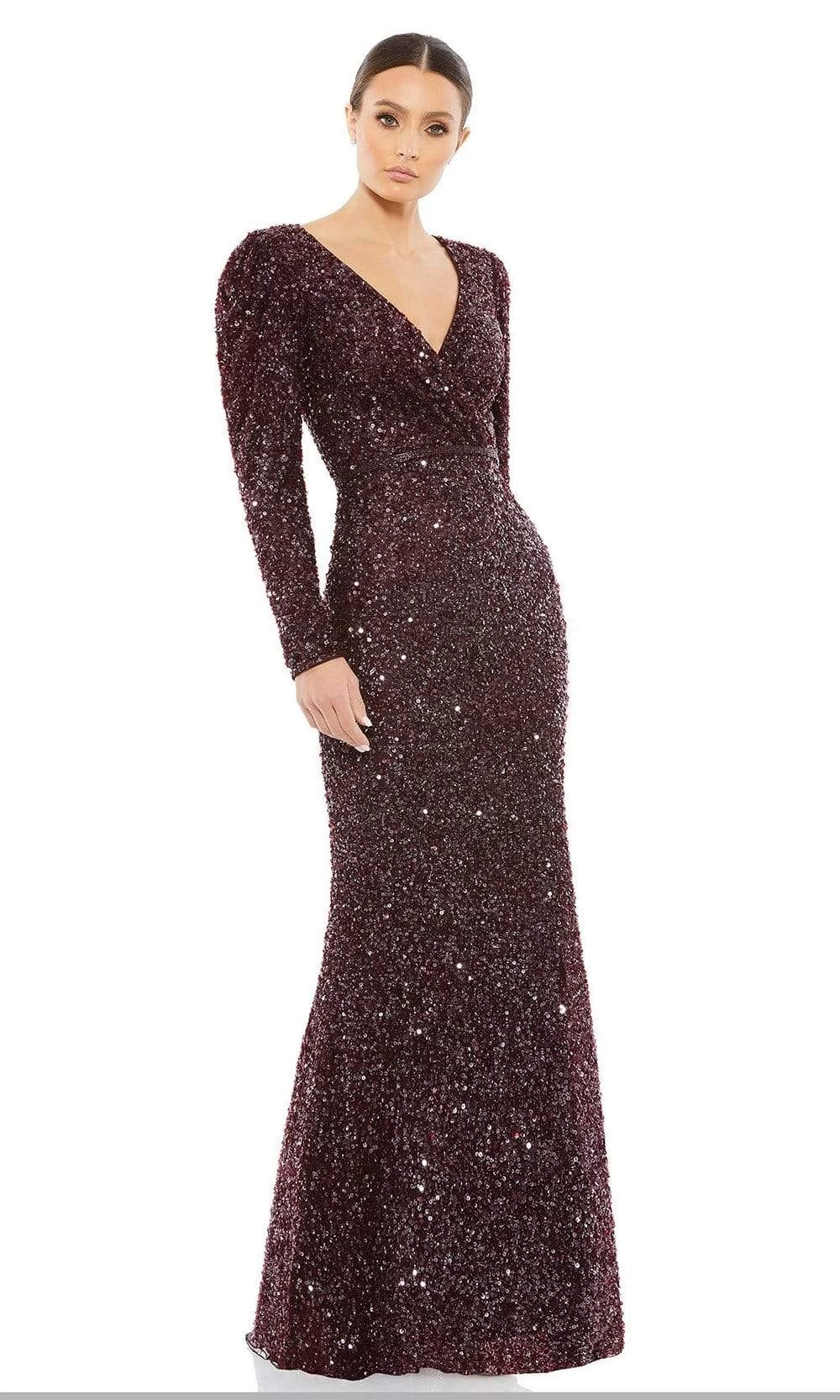 Be adored by the fascinating crowd in this Mac Duggal 5510 creation. Adorned with an exquisite sequined design, this gown has a v-neckline that wraps the bodice. Puff accents ornate the long sleeves that frame the bodice and full back. Embellished along the waist, the gleaming skirt flows into a floor length hemline. Put a sparkle on the dancefloor in this Mac Duggal masterpiece.