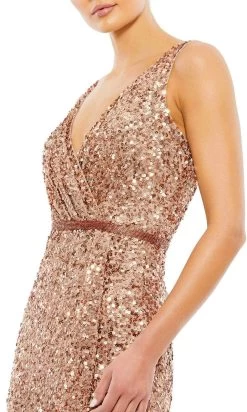 Claim that look of sophistication wearing this classy and gorgeous Mac Duggal 5539 creation. Textured with a crust of iridescent sequins on a tailored silhouette, this stunner creates a wrap style v-neckline with fine ruching. Accentuated with a v-styled back and a zipper closure, a beaded tonal waistband highlights the natural waist. A thigh high slit opens the skirt as it flows into a floor length design. Don a style that speaks of eloquence in this Mac Duggal masterpiece. Model is wearing the Copper color.