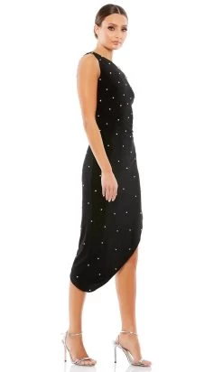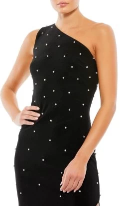 Brave the evening with temptress beauty and grace wearing this look by Mac Duggal 55646. Dress yourself in this sophisticated and mature in this simple yet chic dress that features a figure hugging silhouette with its jersey fabric. Covered in rhinestones that are arranged in a polka dot pattern, so it looks quite festive. One-shoulder neckline paired with asymmetrical hem, this dress is a perfect addition to your wardrobe. Catch attention effortlessly with this sexy Mac Duggal masterpiece. Model is wearing the Black color.