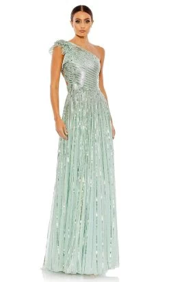 Flourish an iridescent style in this Mac Duggal 5565 creation. Adorned with sequins in a stripe motif gleaming the entire silhouette, this piece shows a one shoulder neckline. Straps ornate the laced up back. A flutter sleeve accents on shoulder as the A-line skirt cascades into a train. Fancy a romantic night of celebration in this Mac Duggal masterpiece.