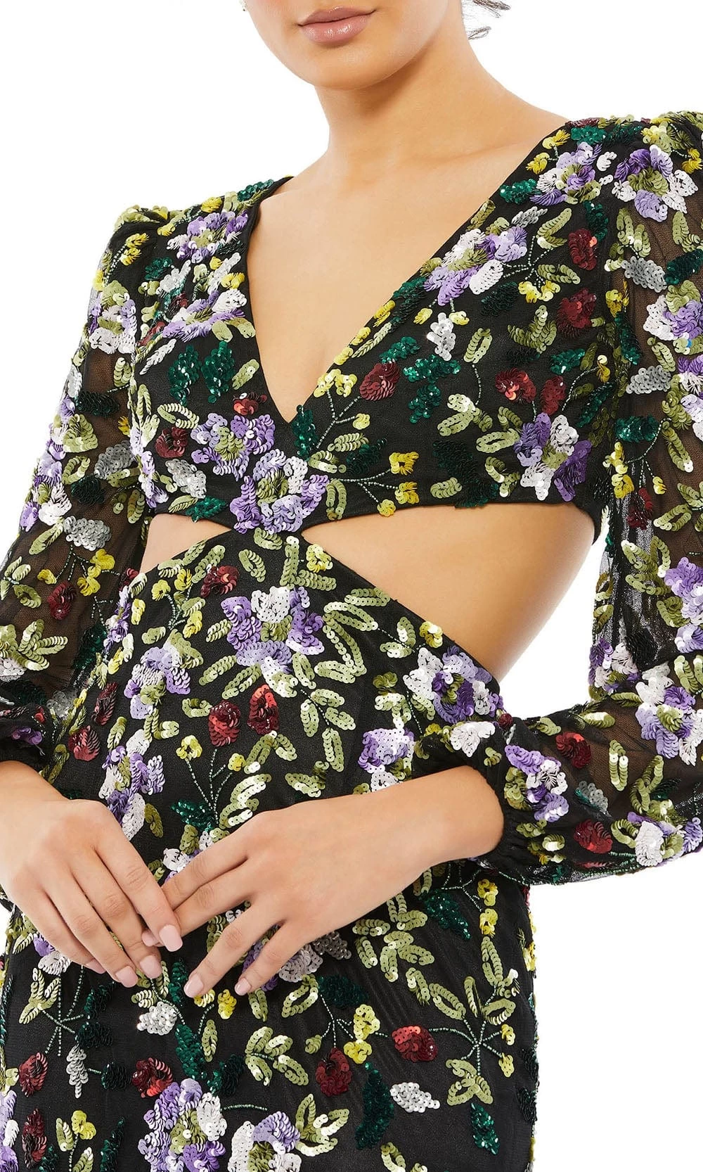 Sparkle in beauty wearing this Mac Duggal 5566 evening gown. This stunner features a fitted silhouette in floral sequins, with a V neckline and long puffed sleeves. The full back has a back zipper closure while a sexy cutout highlights the side and back that lets you show off some skin. The skirt parades a sheath silhouette and finishes to the full length hemline. Be ready to mesmerize the night in this Mac Duggal masterpiece. Exquisite attention to detail is the hallmark of Mac Duggal dresses. Mac Duggal dresses encapsulate the very essence of the women who wear them, reflecting their confidence, feminine power, and inner beauty.