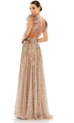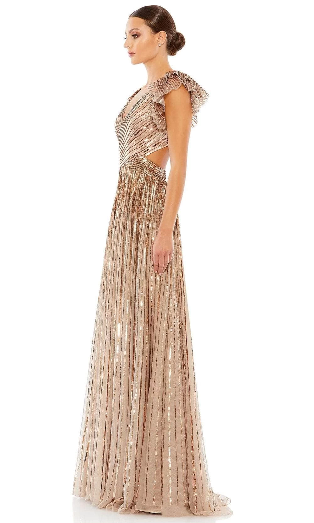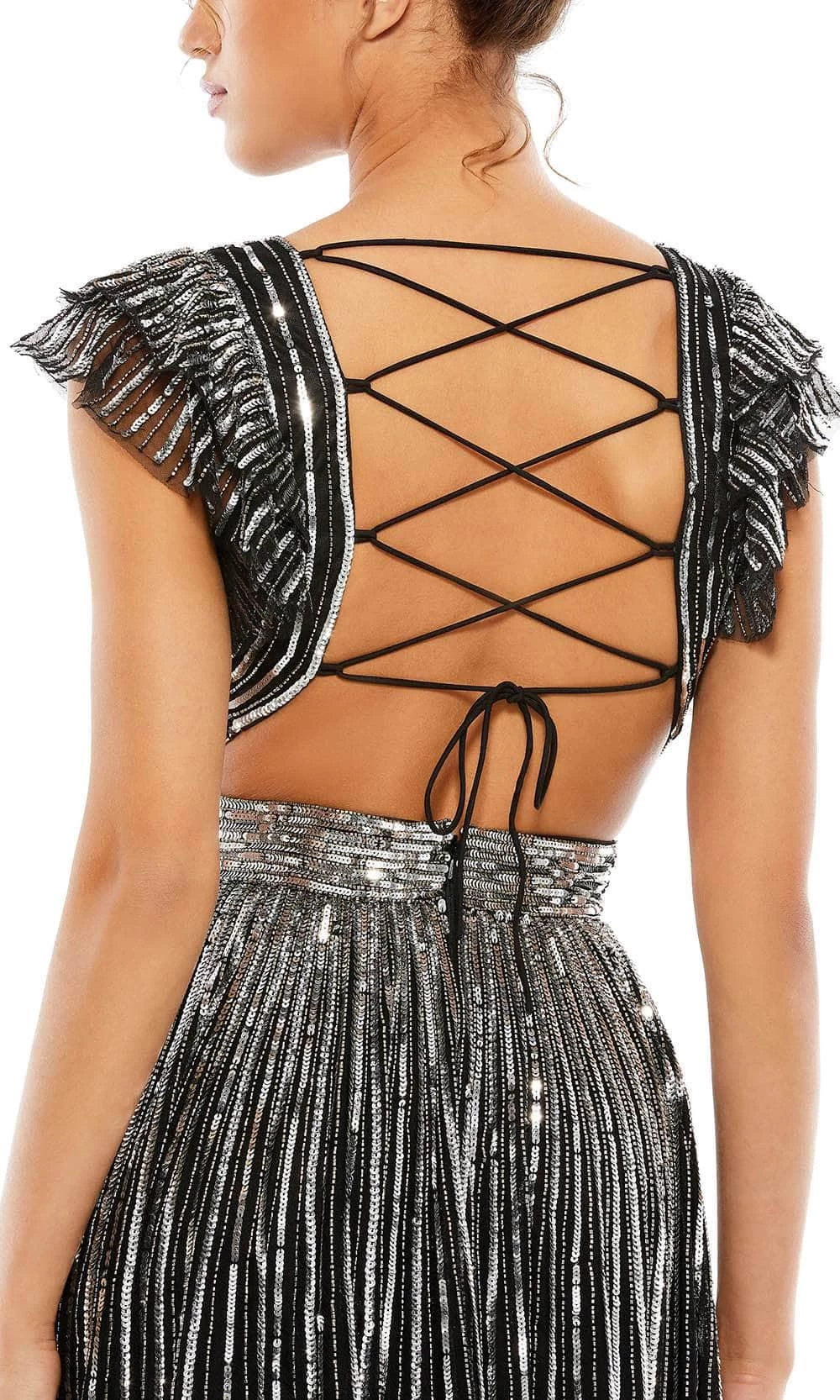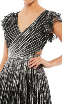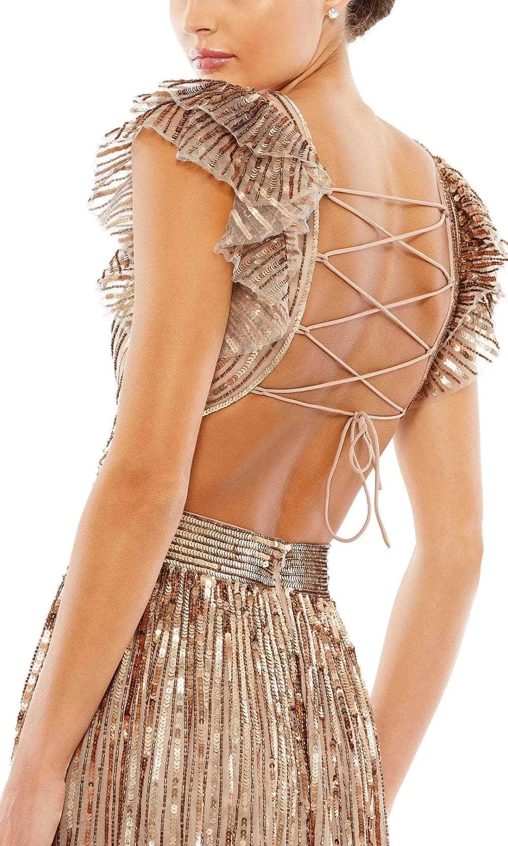 Reveal hidden charms in this lovely evening gown by Mac Duggal 5568. This elegant dress is designed with short flutter sleeves that is paired with a V-neckline that is styled like it is wrapped on a fitted bodice. Shower of sparkling sequins will leave you shimmering all night long. Lace-up straps at the back revealing an open style and the side cutouts will give emphasis to your alluring figure. The skirt mesmerizes in an A-line silhouette finishing at a sweeping train. Be strikingly gorgeous in this sparkling dress by Mac Duggal. Models are wearing Copper, and Black Silver colors