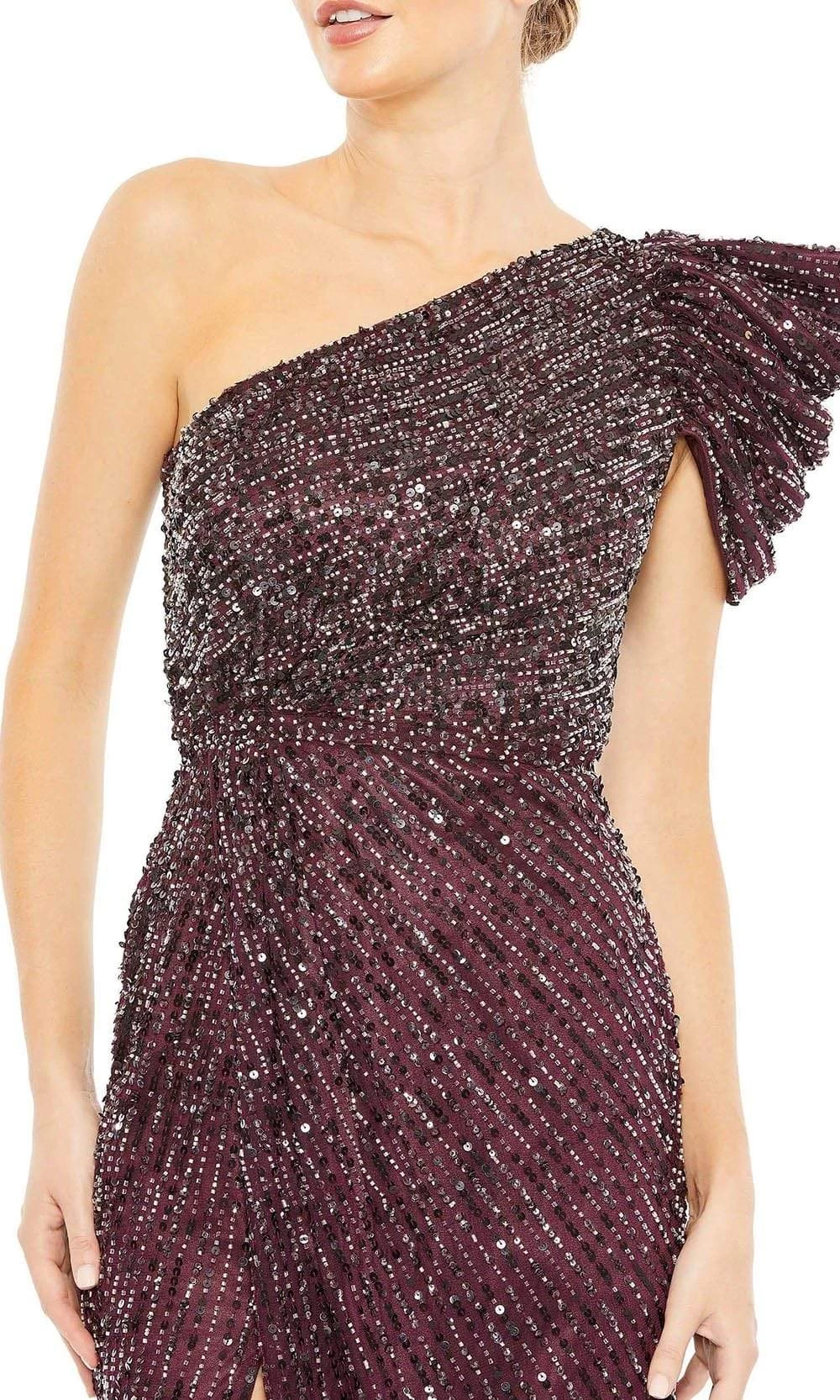 Make such a stunning entrance in this ornate Mac Duggal 5622 creation. Embellished with gleaming sequins ornamenting its length, this gown features an oversized draped sleeve atop its one shoulder neckline. A high slit ornates the sheath skirt as it falls to the floor. Fantasize no more in this Mac Duggal masterpiece.