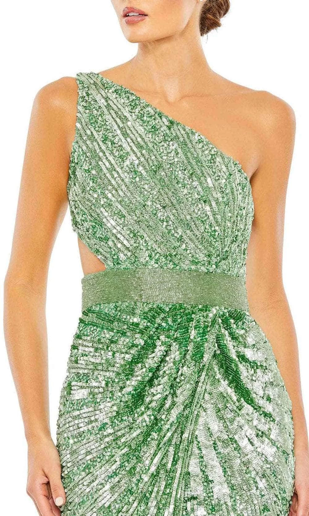 Capture that striking presence in this romantic Mac Duggal 5687. This exuberantly crafted sleeveless dress showcases an asymmetrical neckline with crystals carefully sequined on it and a perfectly fitted bodice styled in gleaming sequins. You will undeniably look hot in its one-side cut-out and the thigh-high slit that offers a sheath silhouette. The fabric is a sequined mesh overlay and the lining is 100% polyester so that you can comfortably move your way. Flatter your finest assets as you enthrall the crowd in this Mac Duggal creation! Models are wearing Green and Silver color.