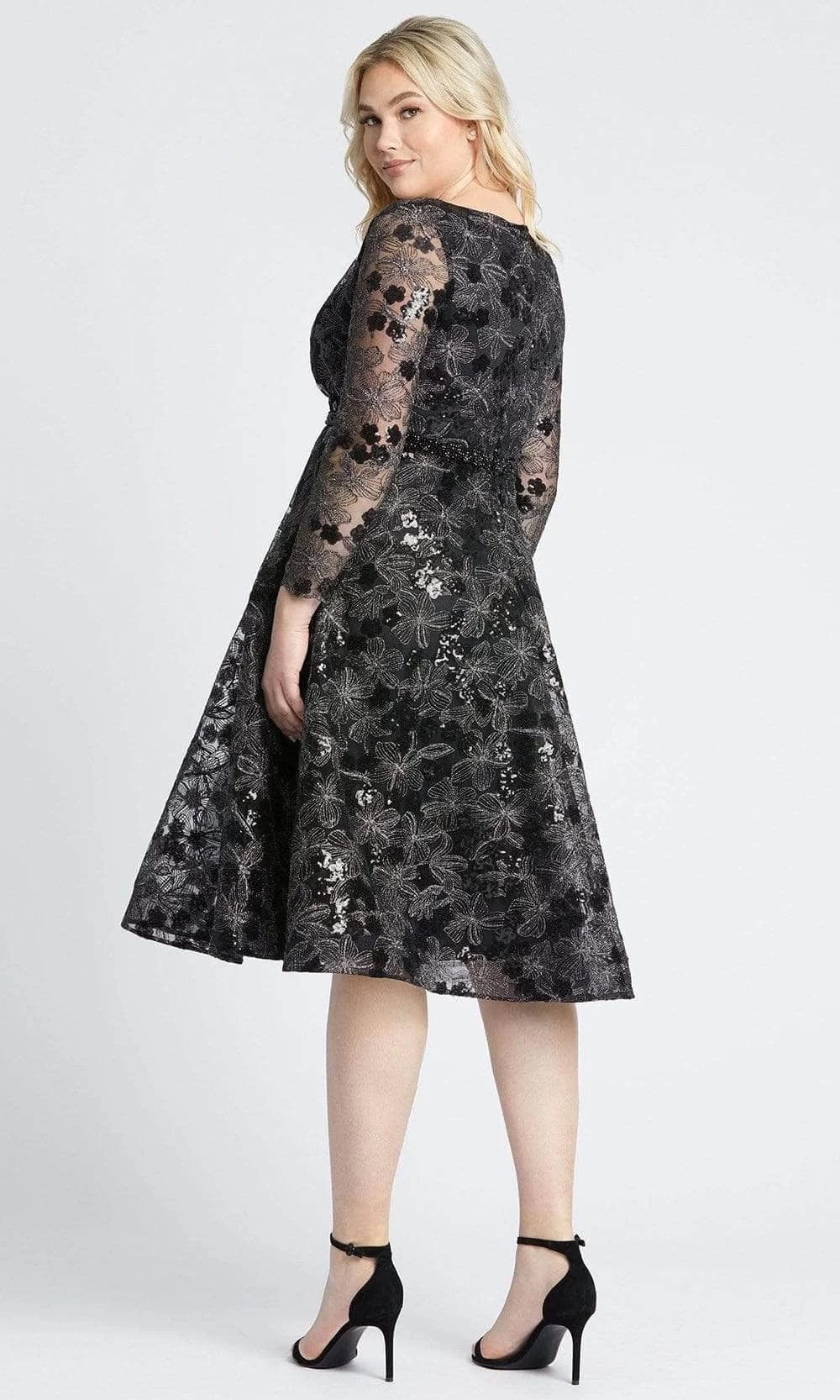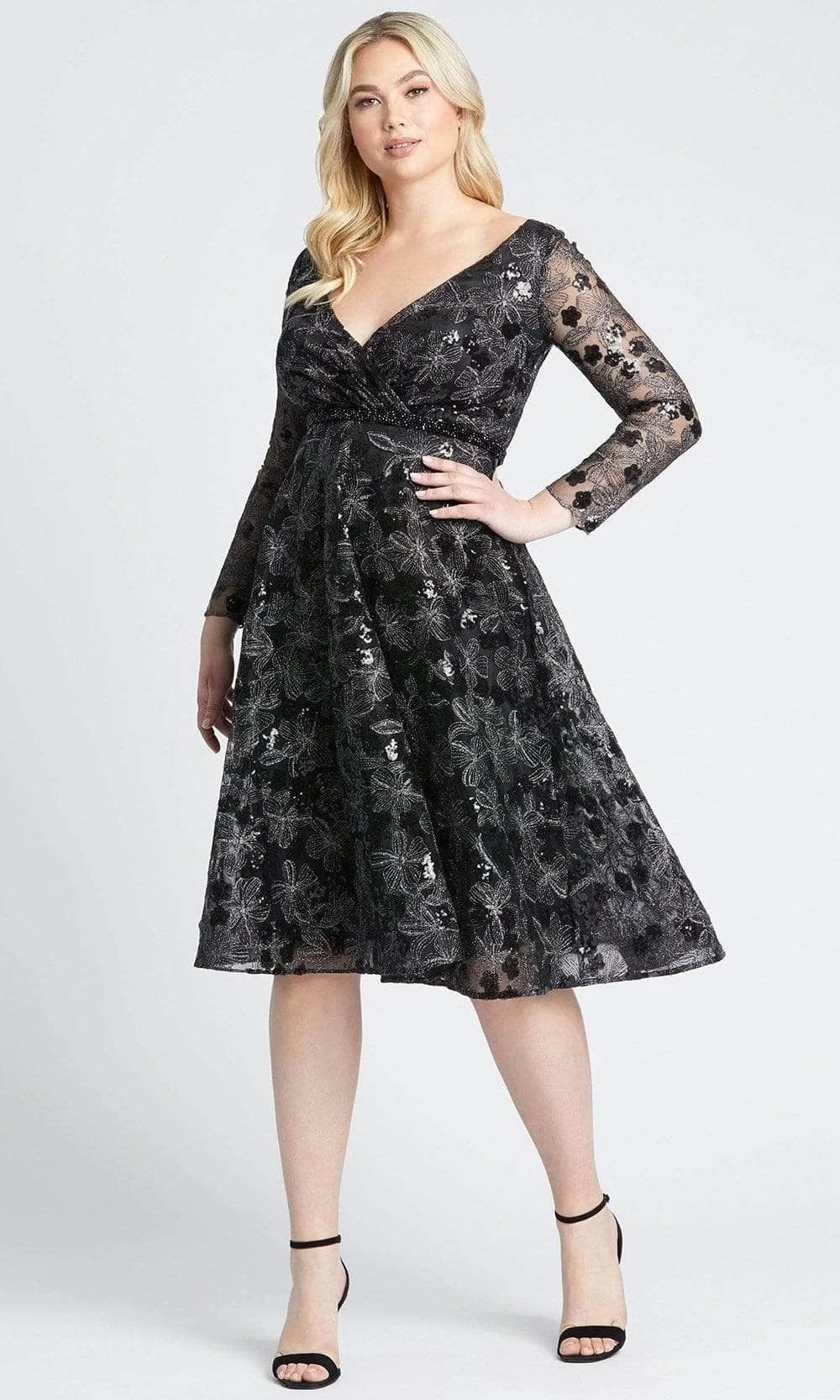 Look sophisticated and classy with this dress from Mac Duggal 67541. This floral patterned dress charms in a plunging V neckline with sheer long sleeves. The dress is designed with beading at the waist and opens a sassy, knee length A-line skirt. Stand out in every occasion with this creation by Mac Duggal.