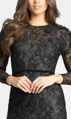 Embrace a wonderful evening in this wondrous evening dress by Mac Duggal 67703. Flaunting a sheer lace bodice adorned with scattered beads and 3D floral lace appliques, this beauty shows a flattering jewel neckline and sheer quarter sleeves. The back displays a fully covered detail and has a zipper closure. Embraced with a beaded belt on the waist, the skirt reveals a trumpet silhouette flare that ends at a tea-length hemline. This Mac Duggal style will definitely bring out the goddess in you! Model is wearing the Black color.