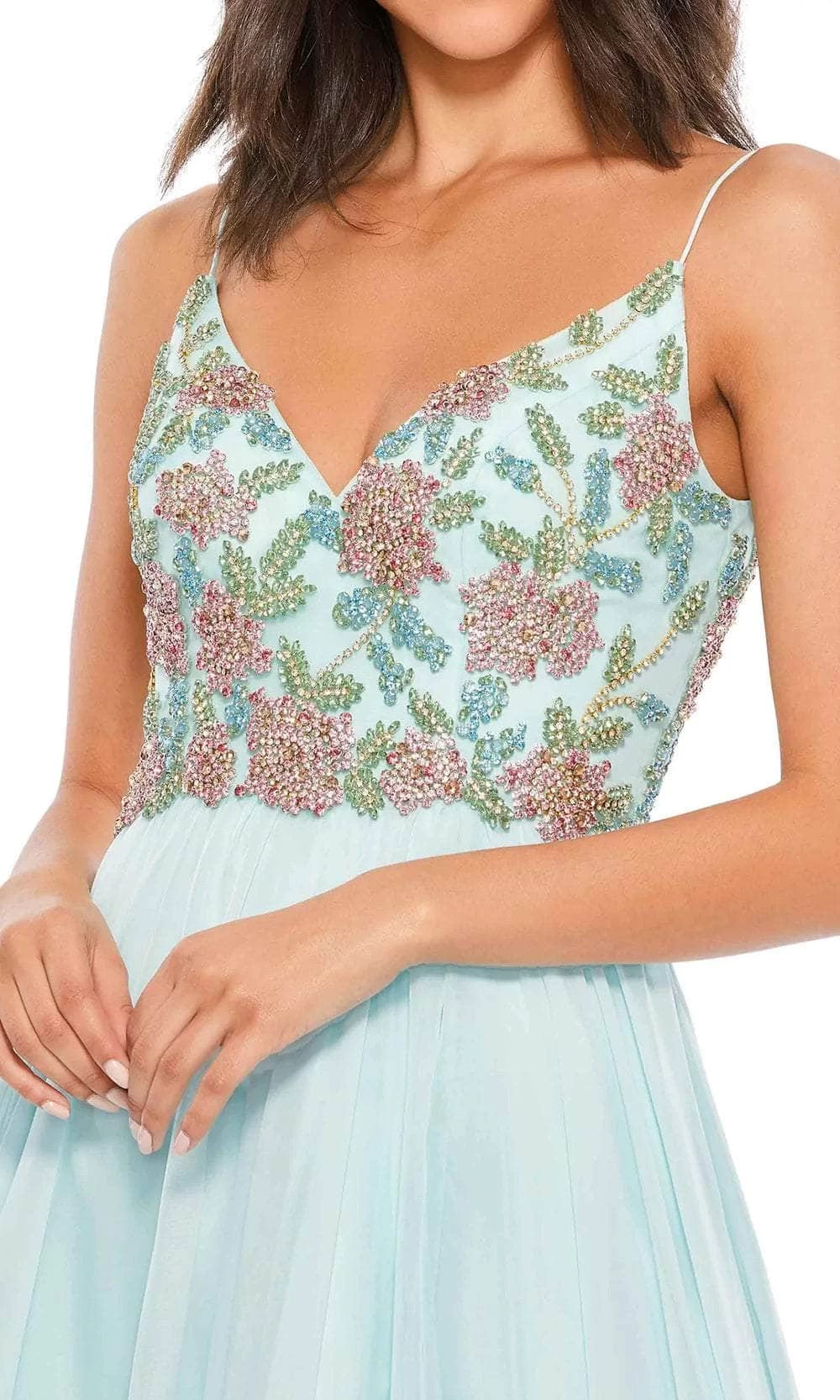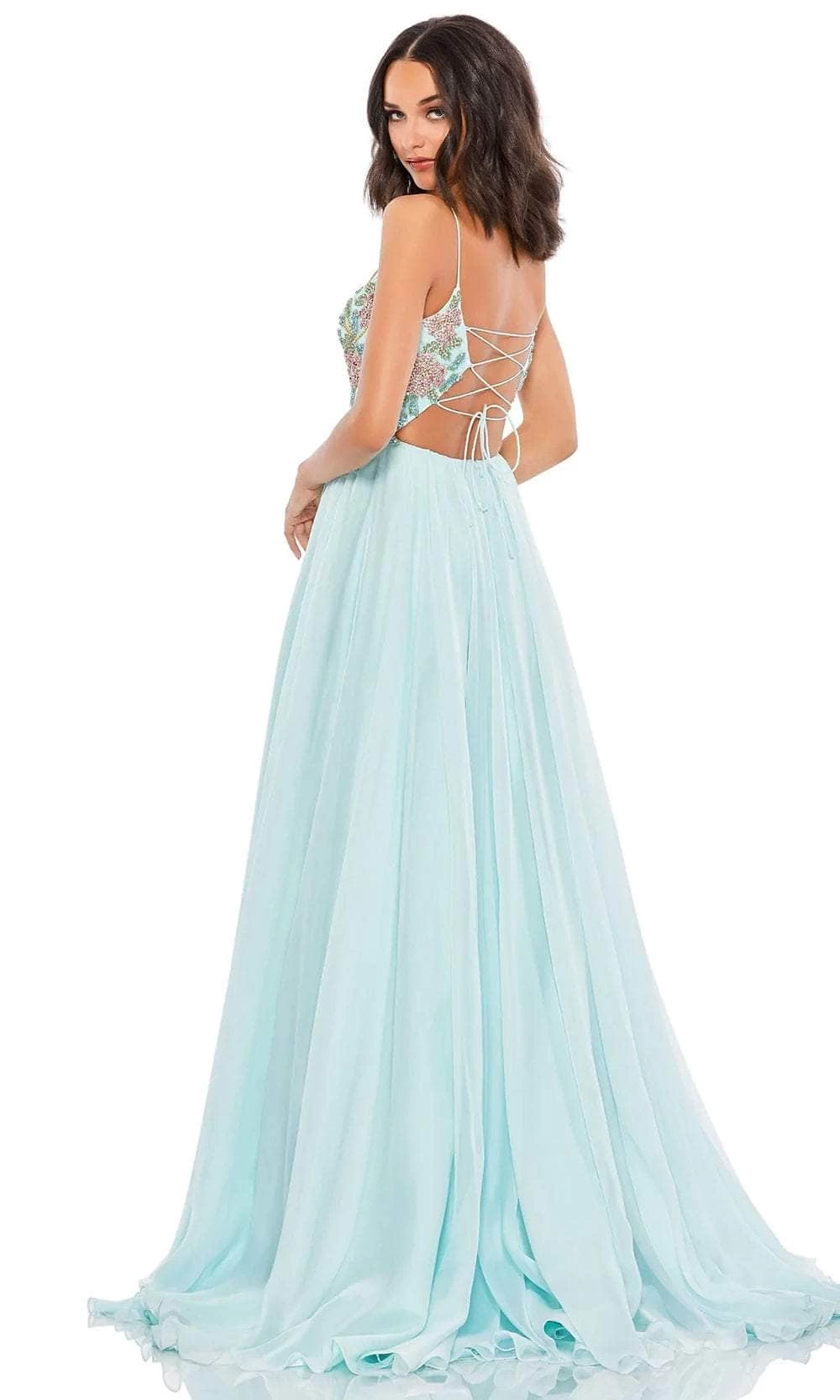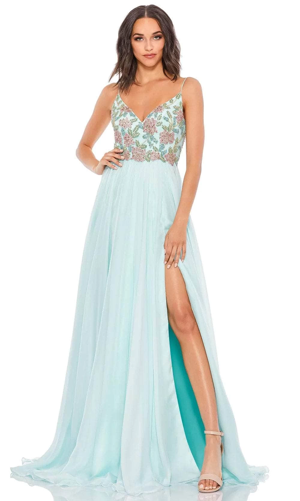 Emanate grace and stunning beauty in this absolutely gorgeous Mac Duggal 67790 creation. This charming dress is decorated in floral applique beadwork, showcasing a deep v-neckline held by spaghetti straps. The back reveals a glance of skin while being secure by a corset-inspired lace-up tie design. Crafted in soft chiffon with stunning pleated details, the skirt flares a full length A-line silhouette and breaks a high slit at the side for an exquisite finish. Exhibit your softer side in this delightful evening gown by Mac Duggal 67790. Model is wearing the Aqua color.