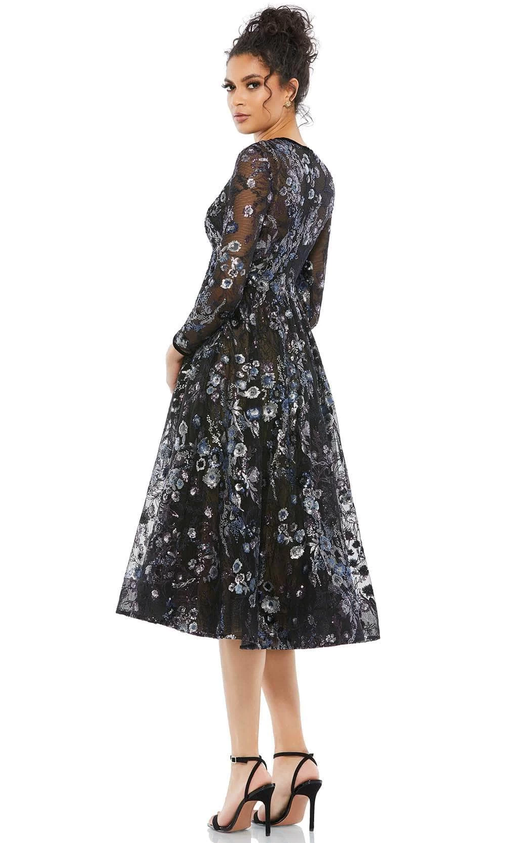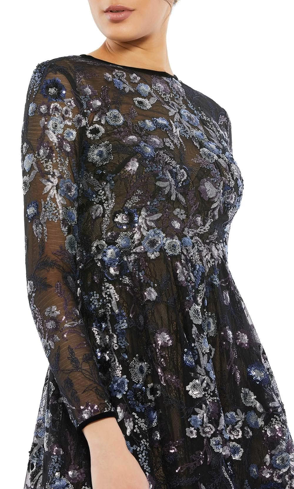 Embrace the pure classiness of this chic Mac Duggal 67851 creation. Defined with a sheer hand-embellished lace overlay with floral sequins and beadwork, this long sleeve dress crafts a jewel neckline coupled with a full back and a concealed zipper closure. Exceptionally accented with hand-beaded allover floral rendering, the natural nipped waist gives way to the fluttering skirt that falls into a tea length A-line hemline. Metamorphose into a new level of elegance in this Mac Duggal masterpiece. Model is wearing the Black Multi color.