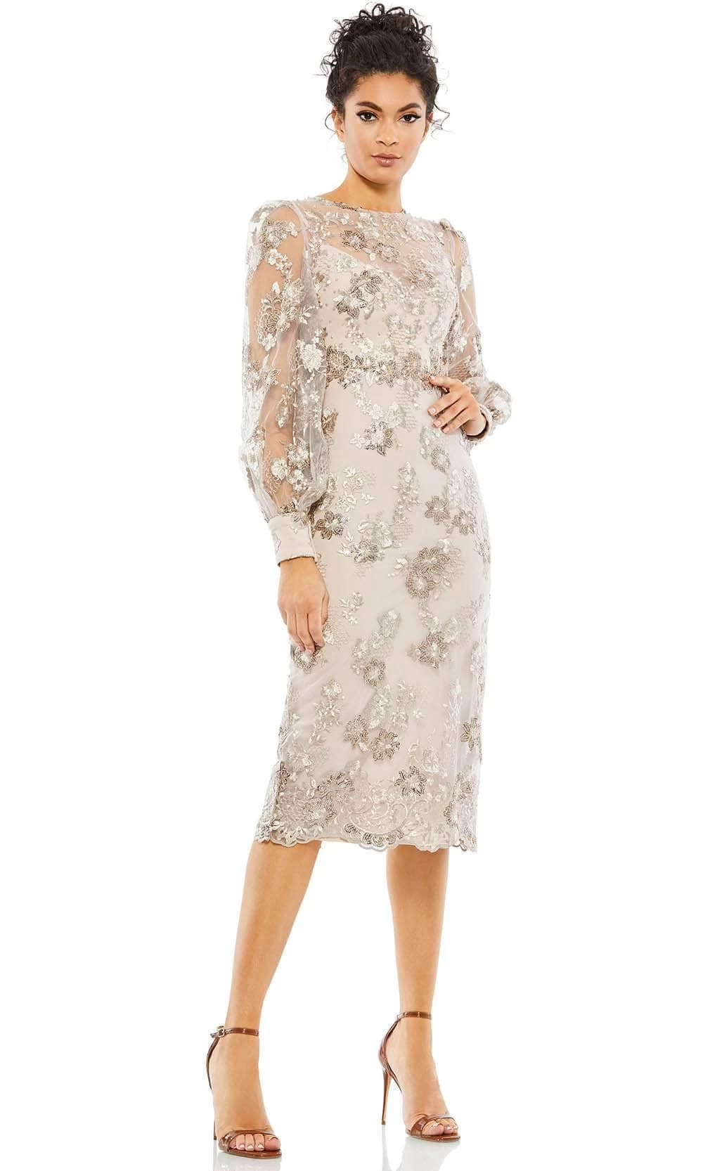 Be a woman of style and beauty in this classy dress by Mac Duggal 67862. This dress features bishop long sleeves and an illusion jewel neckline with a sweetheart lining underneath. The bodice is embroidered with intricate details such as sparkling beads and sequins all throughout. A figure flattering silhouette leads to a sheath skirt and trickles down in a knee-length hem with scallop accents. A full back with zipper closure finishes the look. Everyone who sees you will be left speechless and giddy in this Mac Duggal creation. Model is wearing the Mocha color.