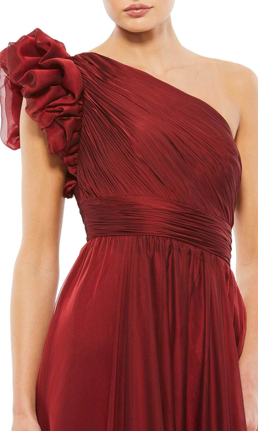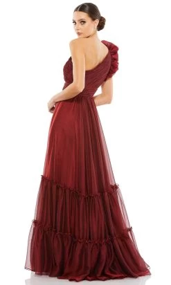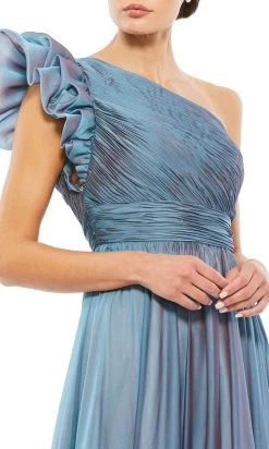 Make an astonishing statement when you walk in this Mac Duggal 67878 creation. This gown is delicately textured with shirring for an elegant look, and it features an asymmetrical neckline and midrise back, as well as a dramatic single ruffled cap sleeve. A ruched wide waistband accents the full length A-line skirt and features a ruffled tier design with a sweeping train exit. Be ready to mesmerize the night in this Mac Duggal 67878 evening gown. Models are wearing the Fusion Blue and Wine colors.