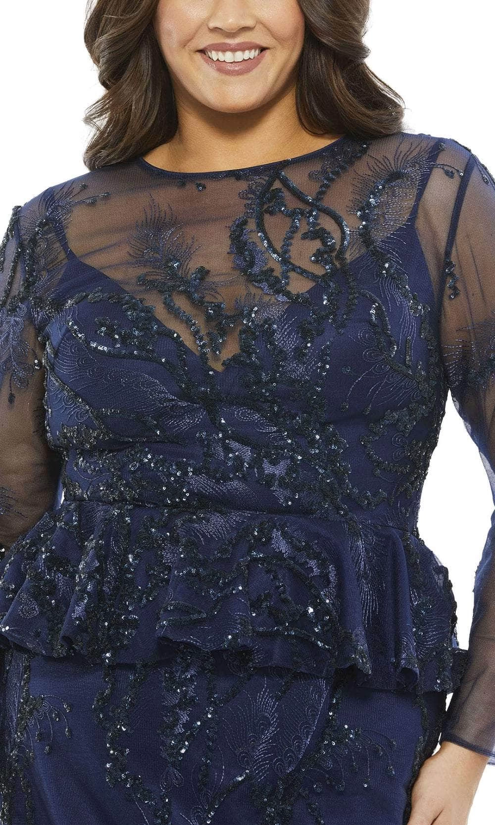 Dress to impress on your next formal event in this simple but captivating Mac Duggal 67930. Covered in a sheer long sleeved style, the top is adorned with streamers of exquisitely crafted sequins and beadwork. Contrasting with the overlay’s high jewel neckline, the inner features spadgetti straps and V neckline. Peplum frills adorn the natural waist, adding an extra curve to the silhouette. The tea length skirt is decorated in a similar fashion for a cohesive look. Steal the show wearing Mac Duggal 67930. Model is wearing Midnight color.