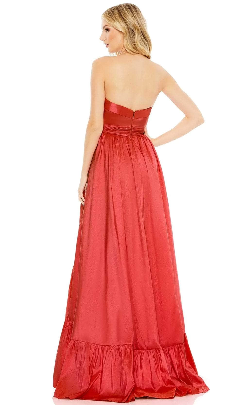 | Details: | Strapless, Foldover Trim, Ruched, Wide Waistband, Ruffle Drape, Mid-Open Back, Slit, Sweep Train |