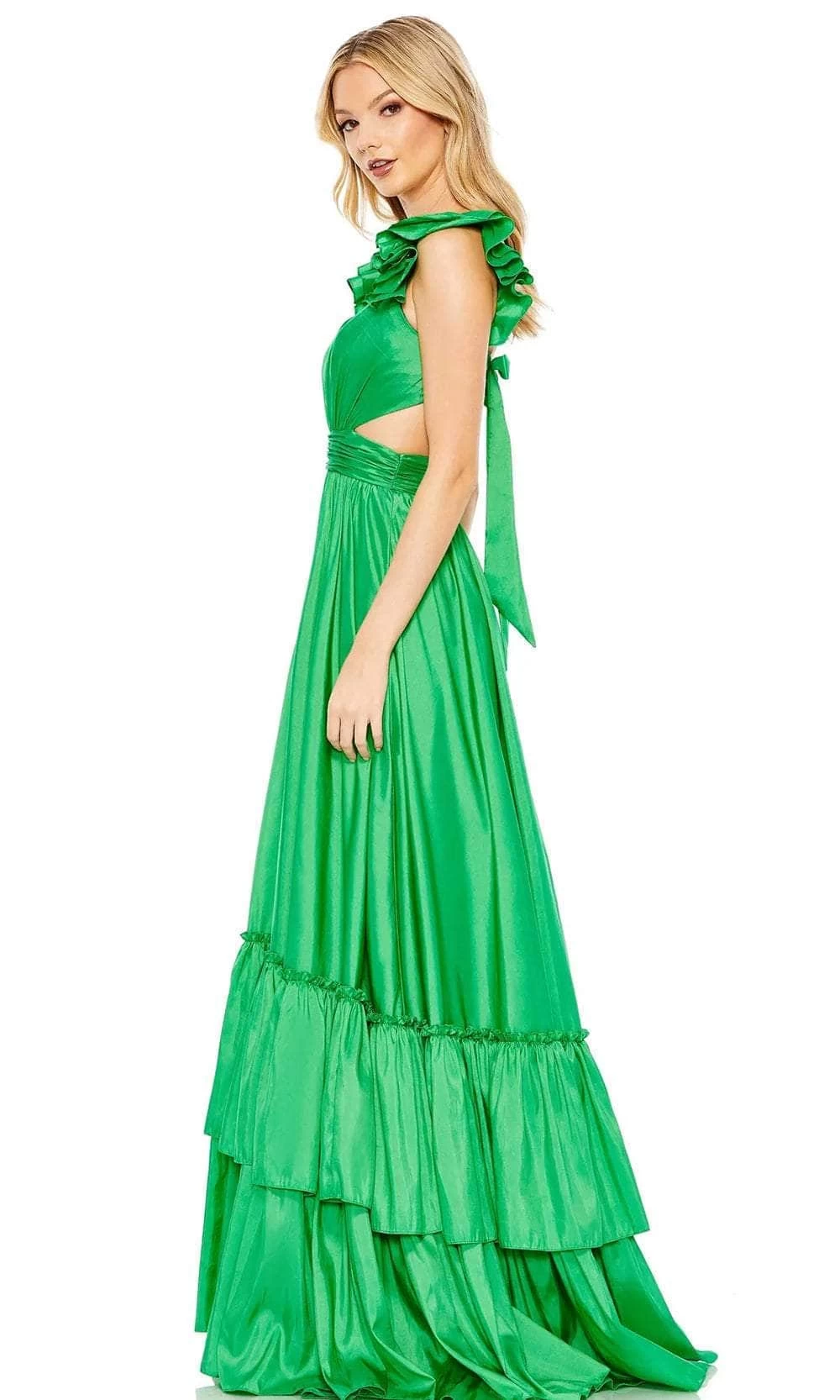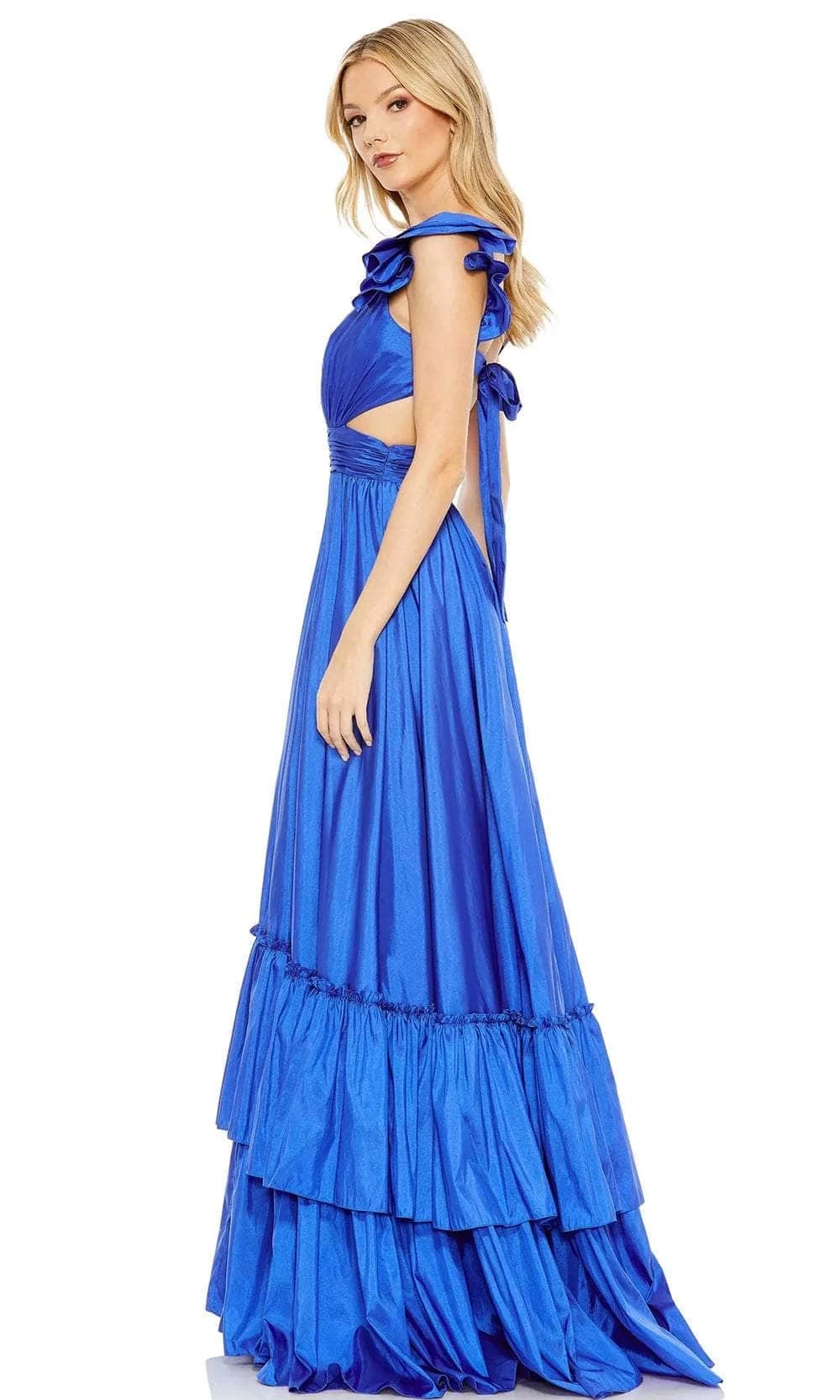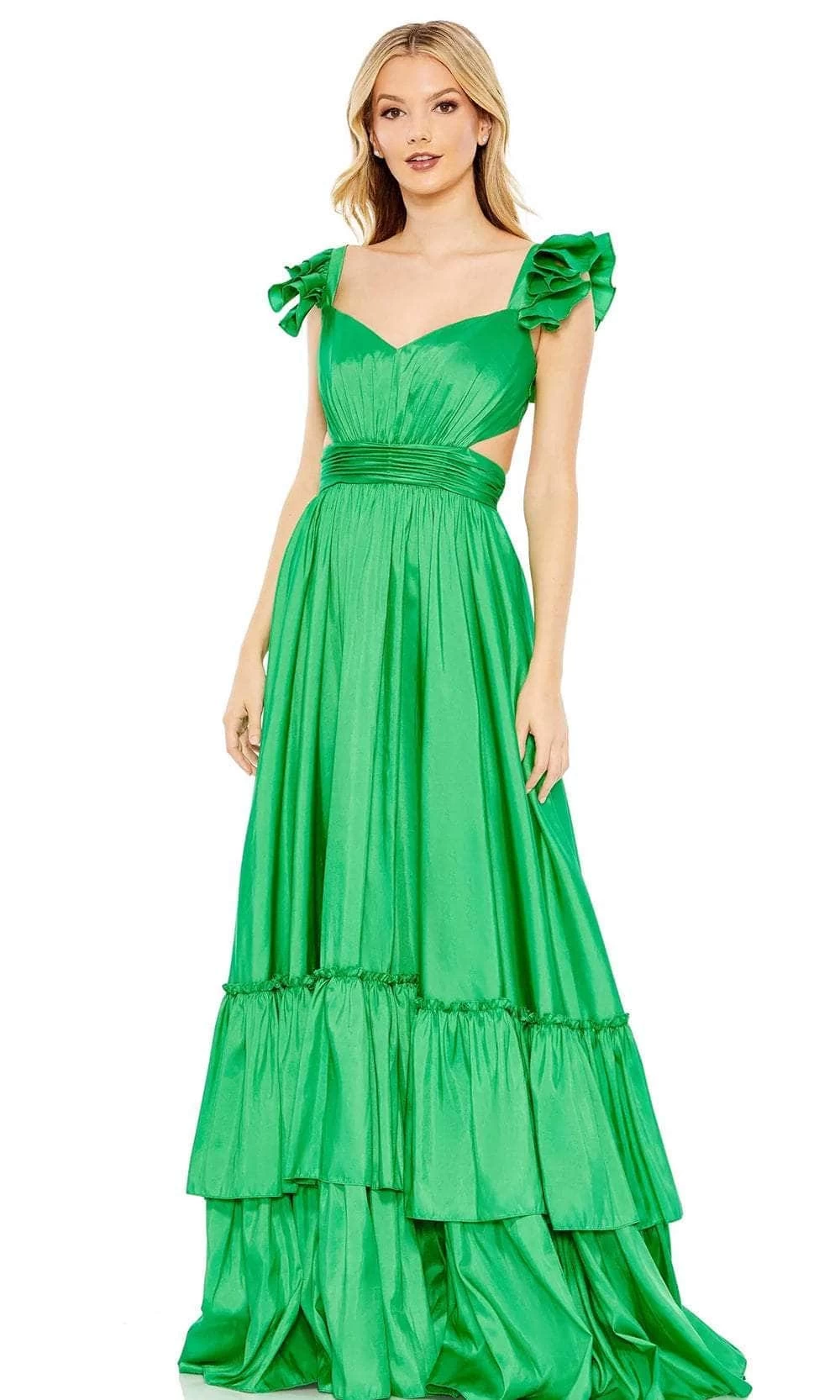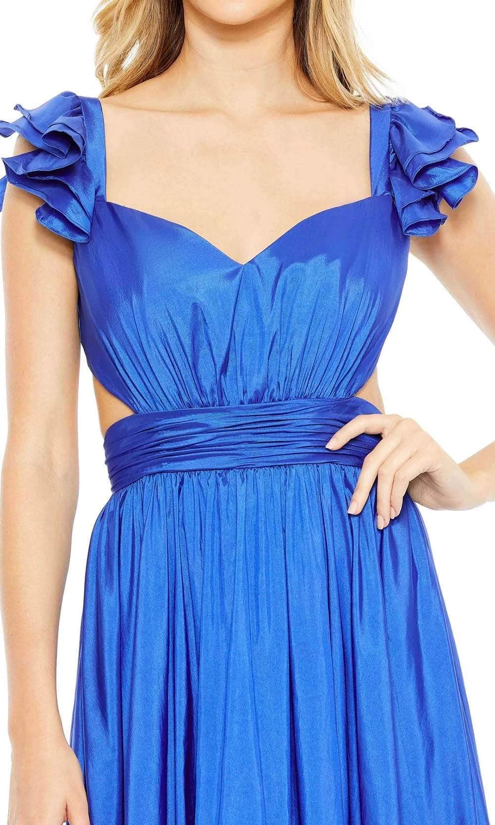 Look fabulous for your event wearing Mac Duggal 68062 creation. Alluringly fashioned in taffeta fabric with ruching detail throughout, this piece displays a sweetheart neckline, flutter sleeves and an open tie back. The natural waist highlights a ruched band and side cutout for a more stylish looking. With a ruffled two-tiered hem, the A-line skirt gracefully streams down to a full length and sweep train. This Mac Duggal 68062 prom gown is sure to be both comfy and fashionable. Models are wearing the Cobalt, Lime and Magenta colors.