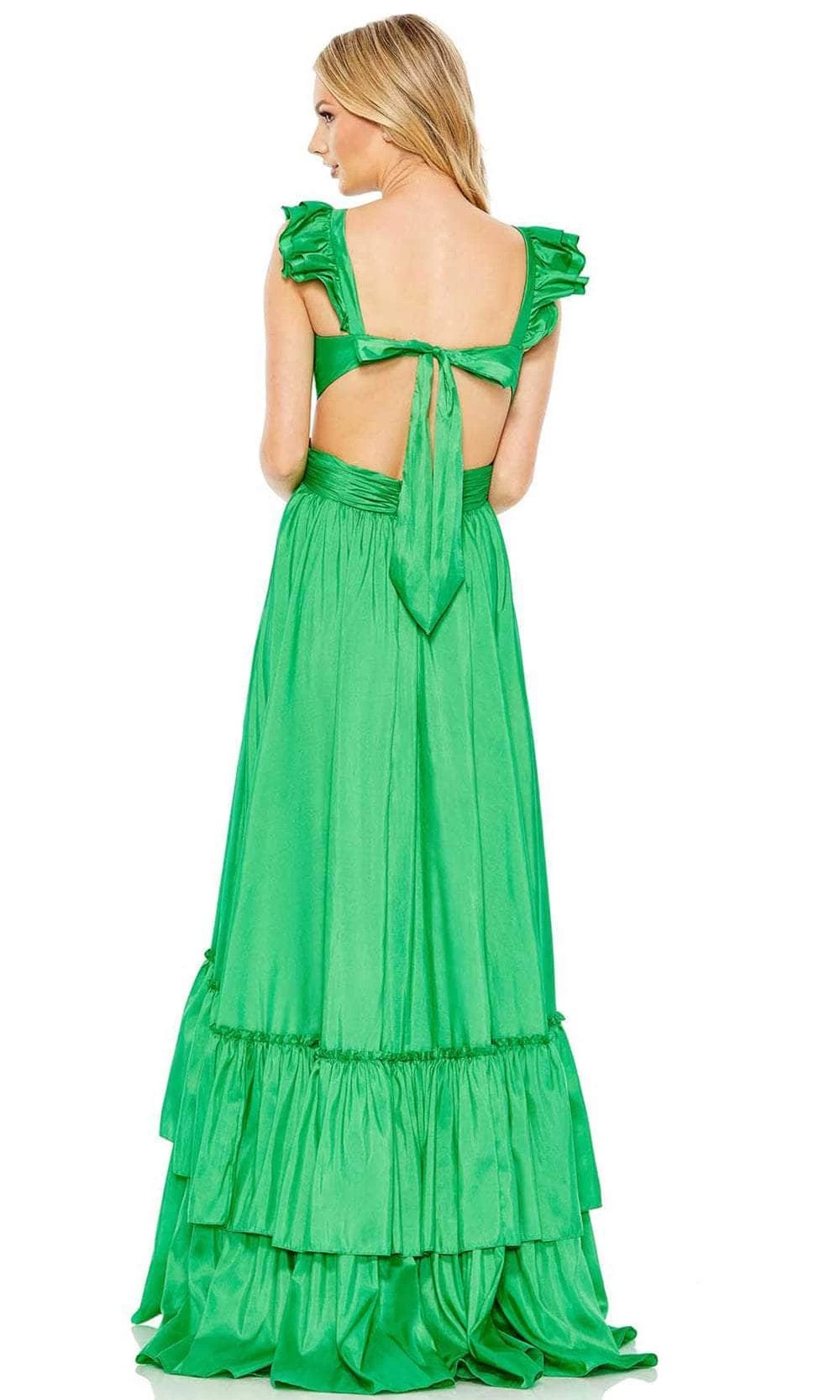 | Details: | Flutter Sleeve, Ruched, Ruffled Tiered, Wide Waistband, Tie Back, Side Cutout, Sweep Train |