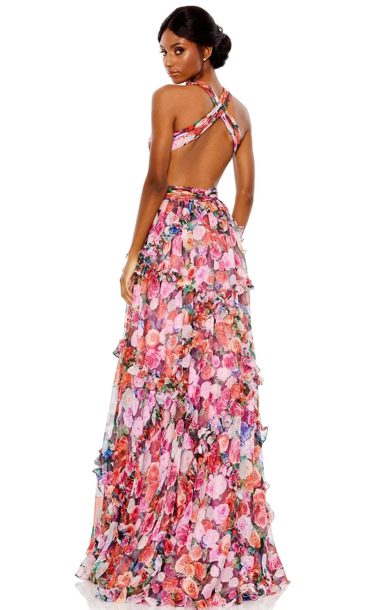 Stand out in every occasion with this daring creation by Mac Duggal 68076. As flowy as a water, as blooming as these flowers you will be! Made with a material printed with rose images gives a summer vibe. The bodice gives a plunging neckline with ruched details and cut out designs to exude sexiness. Reaching the floor with its A-line silhouette and walking with a romantic sweep train. Be in this gorgeous Mac Duggal 68076 creation and leave a lasting impression. Model is wearing Multi color.