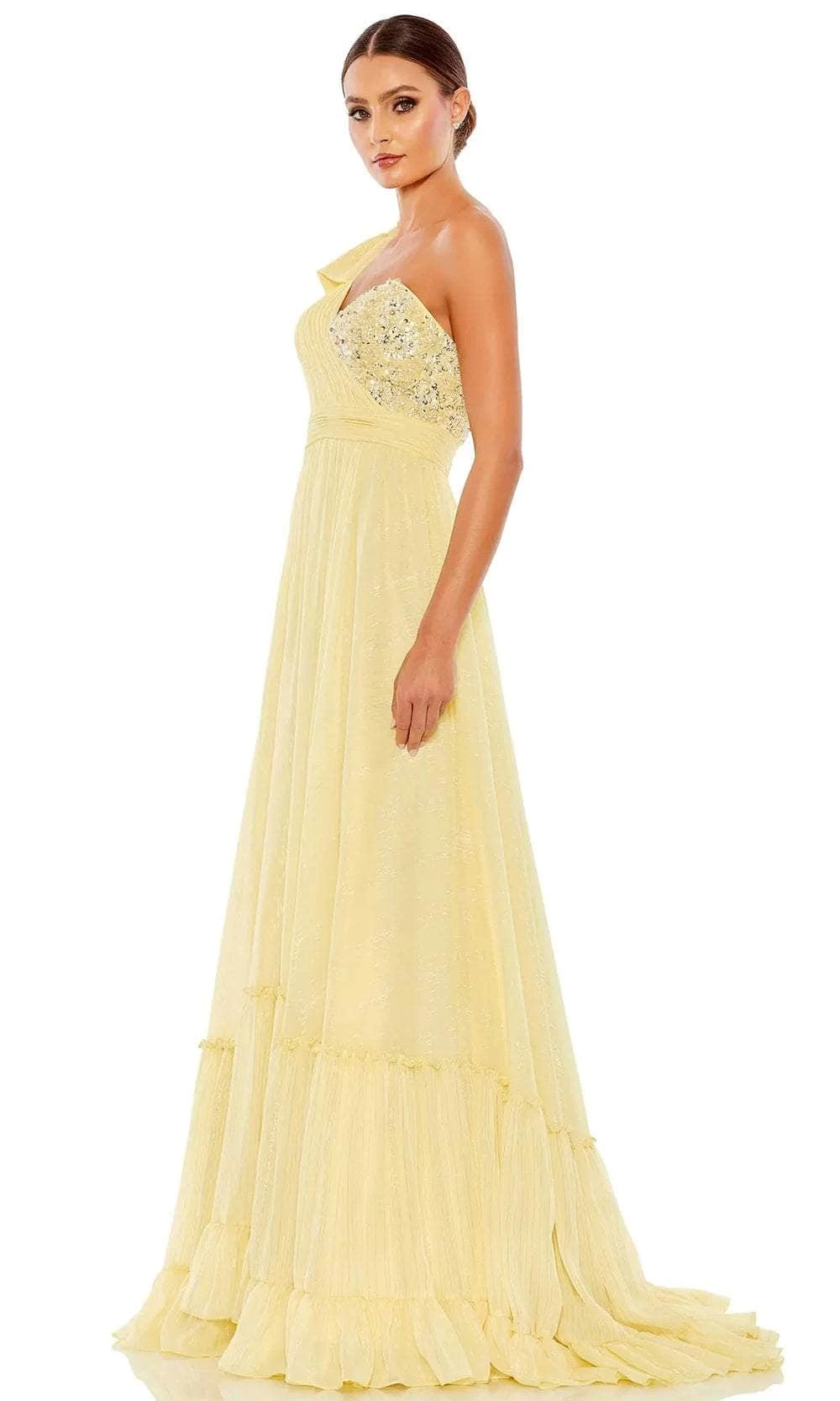 Get a glamorous look underneath this feminine gown from Mac Duggal 68095. It is stunning as it is tailored in shimmer-infused chiffon fabric featuring an asymmetric neckline with a partially pleated and beaded bodice and bow detail at one shoulder. The floor-length skirt showcases a sweep train, ends with a ruffled hem, and closes with a back zipper closure. Get a glamorous look with this Mac Duggal 68095 creation. Model is wearing a Lemon color. Find more Mac Duggal Dresses.