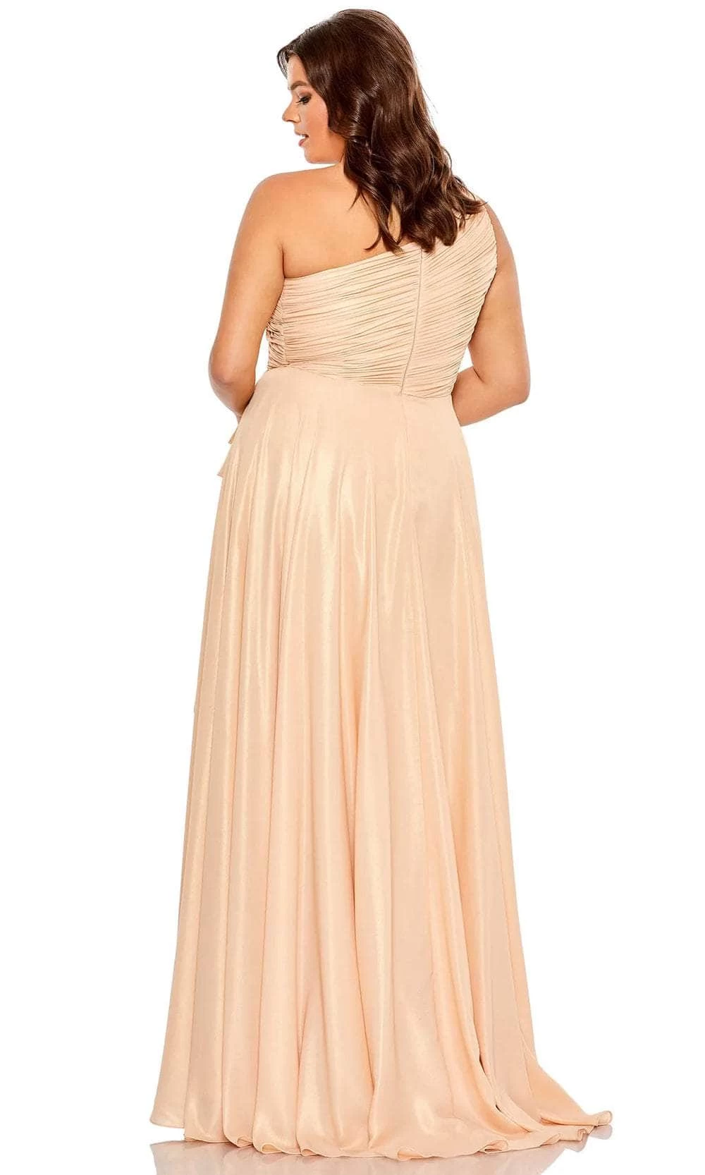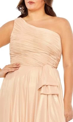 Be the spectacular belle on your next formal event in Mac Duggal 68125. In this spectacular evening gown, soft fabrics take center stage for an alluring effect. The fitted bodice features a one-shoulder neckline, designed with ruched detailing that wraps around the bodice diagonally. From the natural waist blooms out an A line skirt, accented with a draped fabric detail that flows down from the natural waist. The fabric detail adds a lovely tough to the the high front slit. Feel like a goddess wearing Mac Duggal 68125. Model is wearing Gold color.