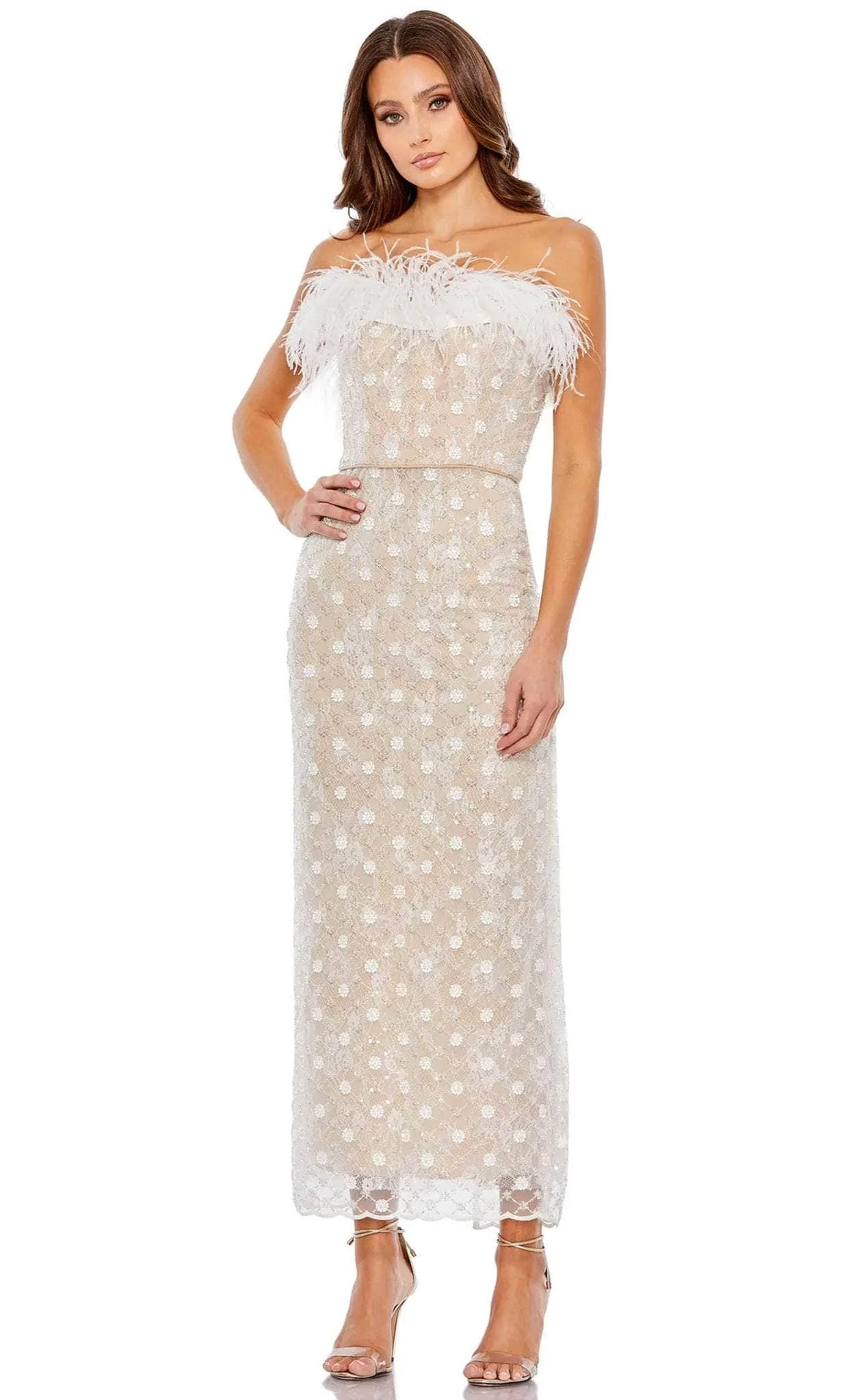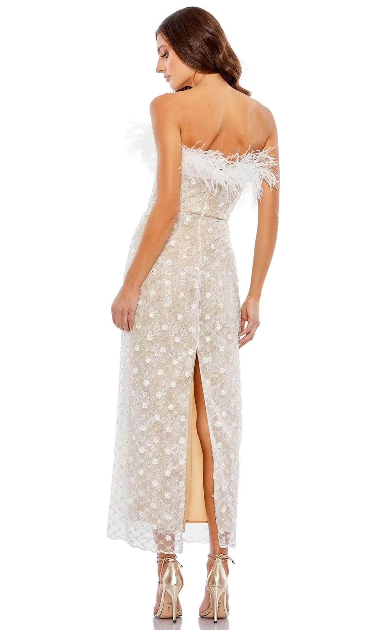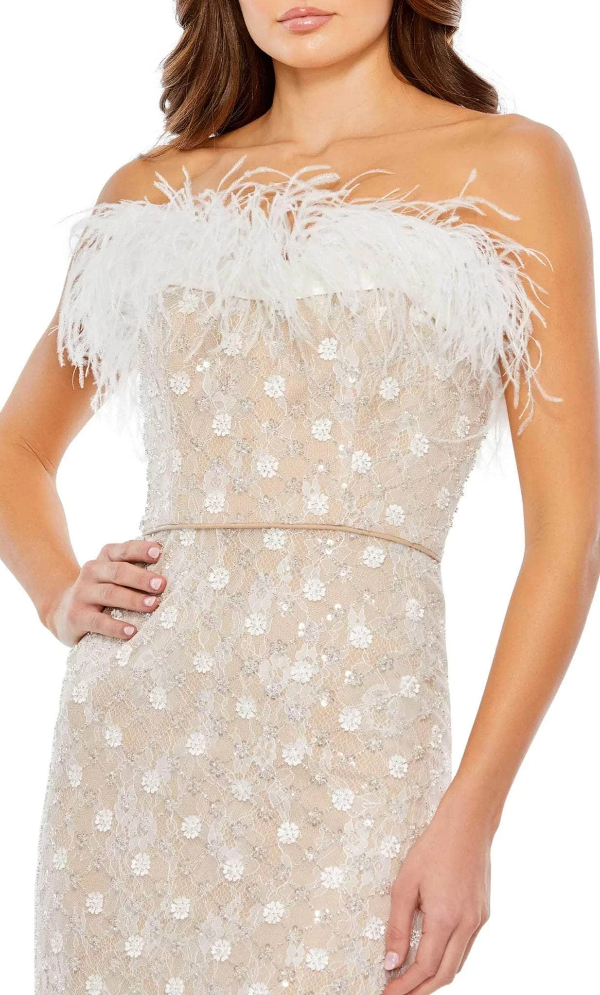 When you walk in this simple yet chic Mac Duggal 68140 dress, expect everyone to stop and stare. This prom dress features a strapless neckline with feather accents that bring a sophisticated appearance. The lace fabric is embellished with floral embroideries. The bodice is cinched at the natural waistline. The skirt has a column silhouette, and the back has a slit, as well as a center zipper closure. Look stunning in this Mac Duggal 68140 ensemble. Model is wearing White color.