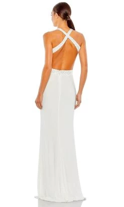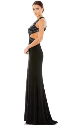 Walk in seduction and style wearing this evening gown by Mac Duggal 68166. Wrapped in an embellished waistband, this studded fitted bodice showcases a low-cut V-neckline on a sleeveless frame. Angular cutouts on the midriff traverses to the open back with crisscross design strap and zipper closure. The flowy skirt drapes gracefully to a floor-fluttering hem complementing with a high slit. Everyone who sees you will be left speechless and giddy wearing this Mac Duggal creation. Models are wearing Black and White colors. Find more Pageant Dresses.