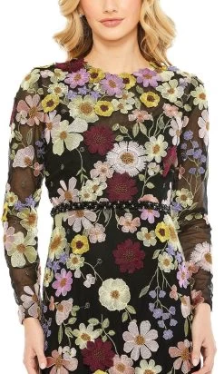 Be the Queen that you are in this long gown creation by Mac Duggal 68201. This gown brings both elegance and flair with its full adornment of vibrant embroideries on a floral motif. Modestly tailored with a high neckline and back, with sheer long sleeves and full length skirt in sheath silhouette. The back has a zipper closure for a perfect fit as the waistline is accented with a beaded waistband. Perfect for the Bride or Groom’s Mother, this Mac Duggal creation is sure to captivate the crowd. Model is wearing Black Multi color.