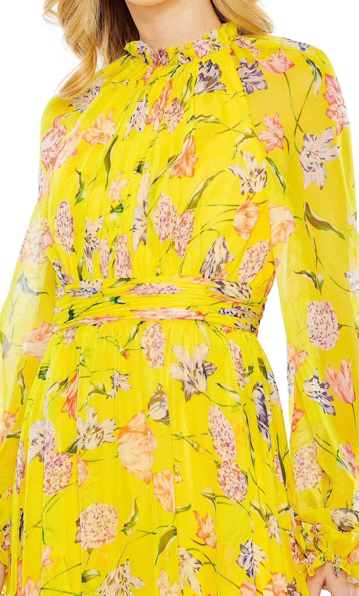 Make a strong impression in Mac Duggal 68218, which exudes flawless charm. Wearing this stunning chiffon dress, which has long raglan sleeves that beautifully frame the bodice and a high neckline, will make you feel comfortable. The back is completely enclosed and fastened with a zipper. The skirt has an A-line silhouette and a high-low hem with cascading ruffle trim. Make the occasion romantic by wearing this Mac Duggal 68218 dress. Model is wearing Yellow Multi color.