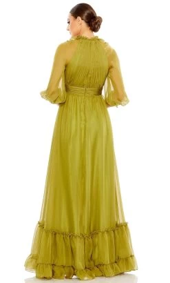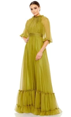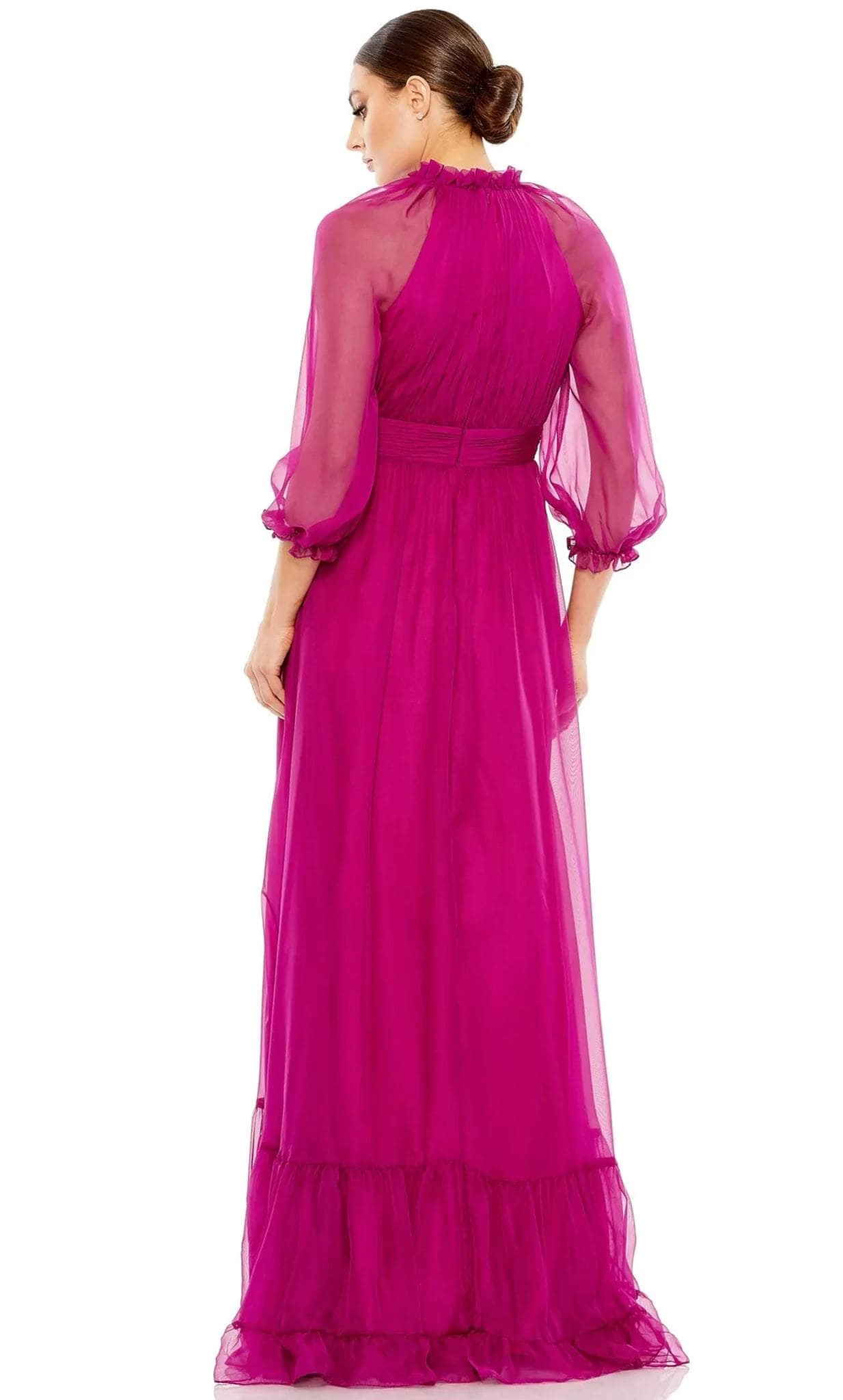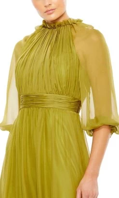 In this Mac Duggal 68225 masterpiece, you can show off your utterly alluring style. Look perfectly elegant in this gorgeous organza-made long dress that features a ruched styled bodice framed with sheer elbow-length raglan sleeves and crowned with a high neckline. The ruched waistband cinched the bodice to emphasize the empire waistline while the skirt cascades into the floor with a ruffle-tiered hemline and parades in an A-line silhouette. Exhibit stunning grace and elegance in this Mac Duggal 68225 creation. Models are wearing magenta and Olive colors. Find more Sweet Sixteen Dresses.