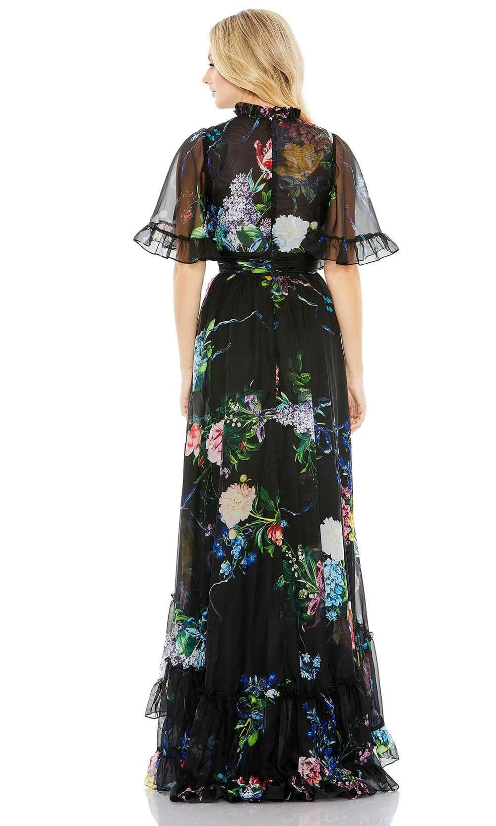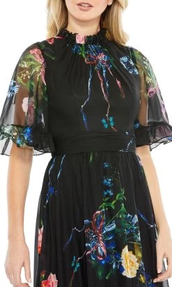 Look immaculately gorgeous in this simple yet sophisticated Mac Duggal 68230 dress. Gorgeously tailored from a chiffon fabric displaying a lovely floral accent, this gown is simply captivating. Featuring a high neckline which is paired at the back, with unlined, short, ruffled-hem sleeves. The back has a concealed zipper closure and from the ruched waistband on your empire waist, an A-line skirt streams on the floor with an elegant high-low ruffled hem finish. Dress to impress with this look by Mac Duggal creations. Model is wearing Black Multi color.