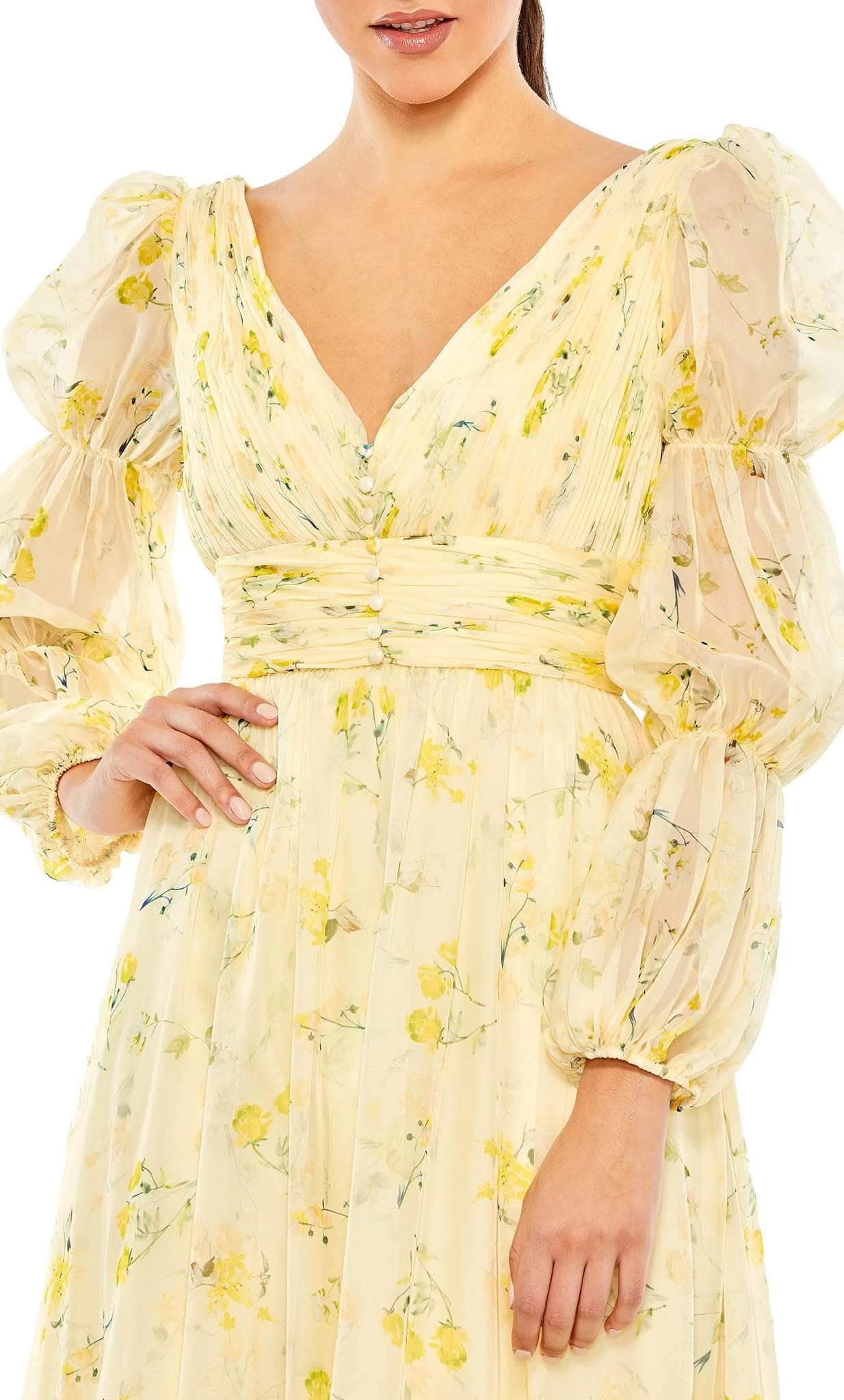 Make yourself into a vision of loveliness in this spectacular creation by Mac Duggal 68246. This charming dress is crafted from chiffon fabric with a floral print design. The v-neckline, illusion long puff sleeve with tier details, as well as a midrise v-back, are featured in this ensemble. It has a captivating wide waistband and front buttons. The A-line skirt highlights the ruffled tiers design and completes the look with a tea length hemline. Unleash an inner glamour that attracts all eyes on you in this Mac Duggal 68246 masterpiece. Model is wearing the Yellow Multi color.