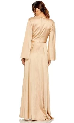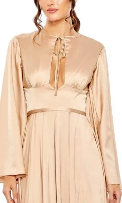 Prepare to amaze everyone with this fabulous creation from Mac Duggal 68308. Charms with a high neckline and accented with a round soft tie and a keyhole. The dress is styled with long bell sleeves. Tailored from charmeuse fabric, the bodice is cinched with a thin waistband. The skirt is styled in an A-line silhouette with a side high slit. Enter the hall with grace and beauty in this Mac Duggal 68308 masterpiece. Model is wearing Midnight, and nude color.