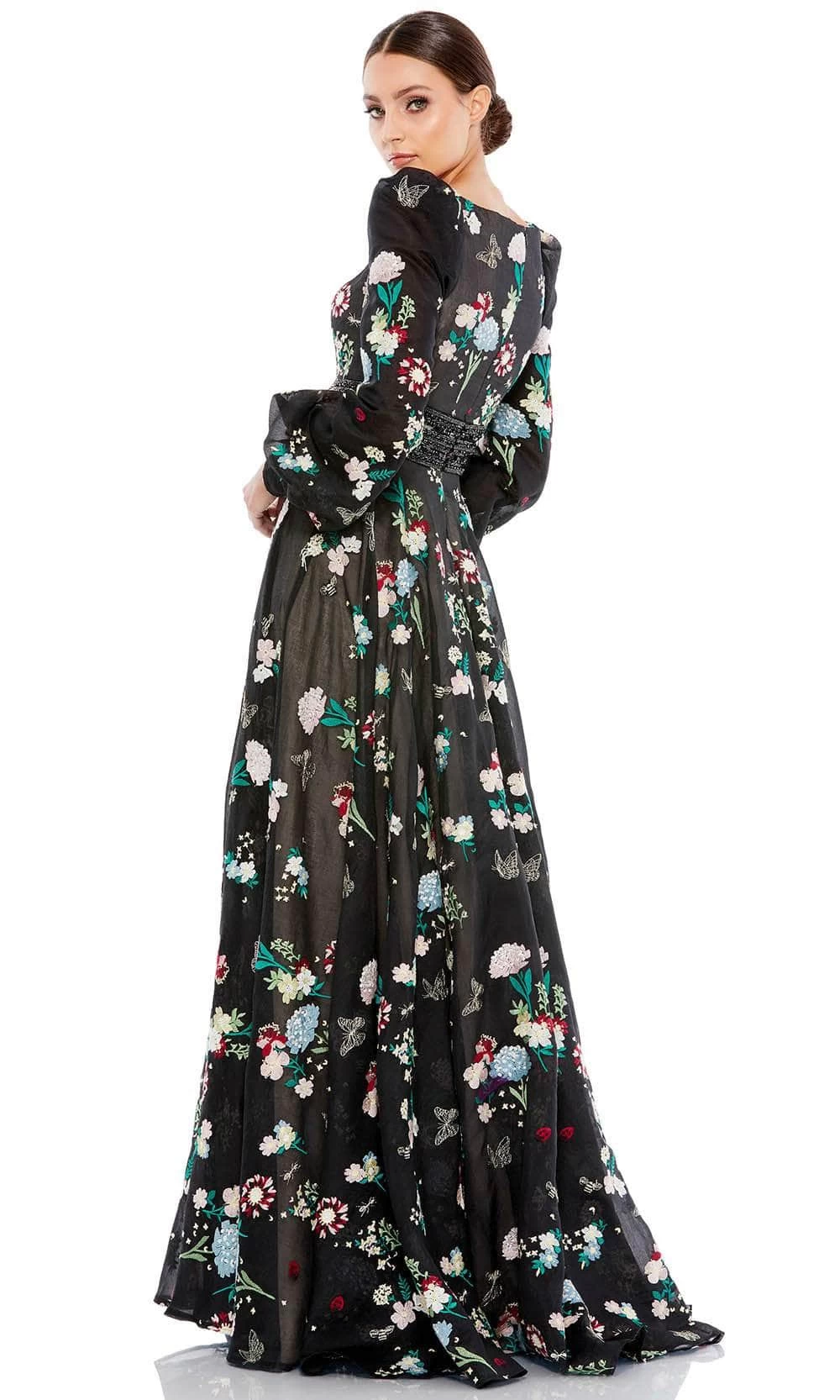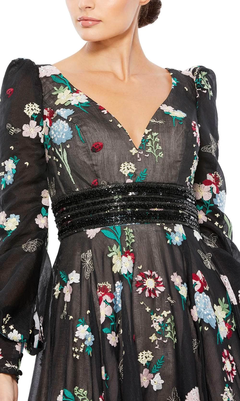 Show off your classy style when you wear this Mac Duggal 79361. This floral embroidered dress showcases a deep V-neckline in a bishop long sleeves frame. It has a full back with zipper closure and has a sequined waistband. The A-line skirt is paired by a high slit before flourishing into full-length hem. Exhibit your softer side as you saunter in this delightful long dress by Mac Duggal. Model is wearing the Black Multi color.