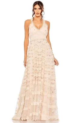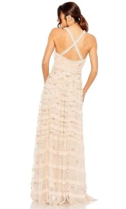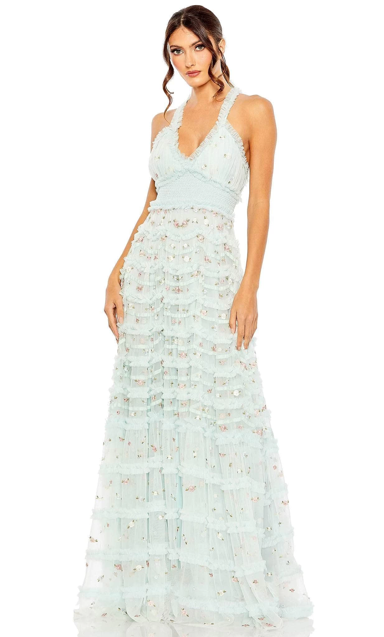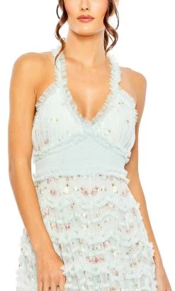 Aspire to exude dominance among the upscale crowd in this utterly feminine Mac Duggal 8037 creation. Gorgeously textured with ruching allover the bodice, this stunner features a deep halter neckline stringed with ruffle ornate straps. Textured with ruffles trimming the edges and the smocked empire band, the back reveals cross strap rendering as floral embroidered details festoon its length. Scalloped details done in ruffle details graces the skirt as it creates an A-line silhouette with a brush of train. Infuse your special event with stellar style in this Mac Duggal masterpiece. Models are wearing the Blue Multi and Blush Multi colors.