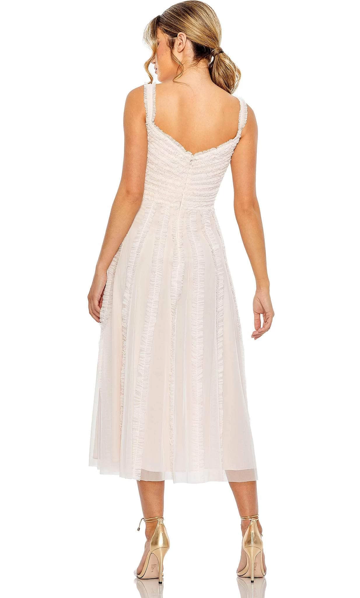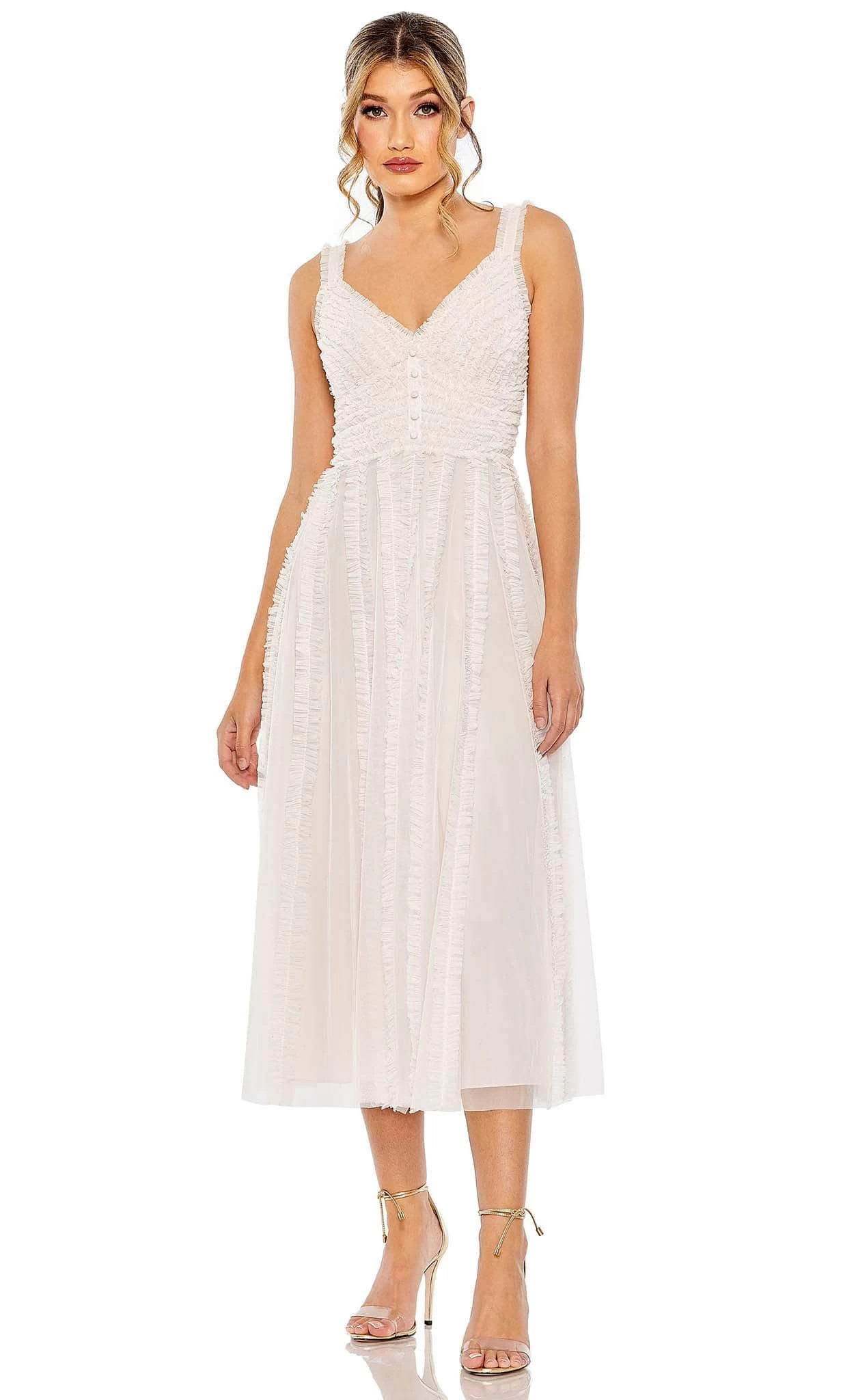 | Details: | Tank Straps, Buttons, Ruffle Detail, V-Open Back, Zipper Closure, Tea Length Hem |