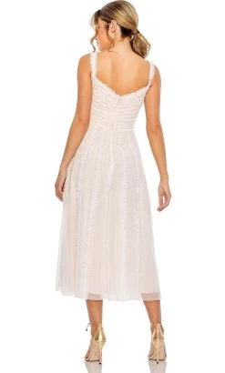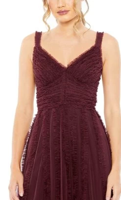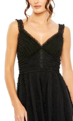 Don a style that will catapult you into the limelight in this Mac Duggal 8056 creation. Alluringly adorned with intricate with ruffle trims cascading allover its length, this ethereal piece features a v-neckline framed with embellished tank straps. Graced with an empire band with button details, this stunner also parades a wide v-open styled back with a zipper closure. Lavishly ornamented with ruffled trims, the A-line skirt cascades into a tea length hemline. Aspire to float into the room like a breath of fresh air in this lavish Mac Duggal masterpiece. Models are wearing the Black, Burgundy and Oyster colors.