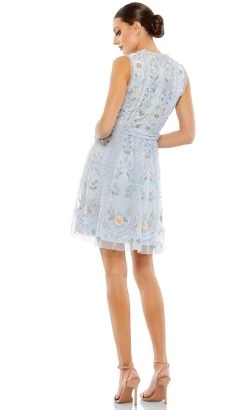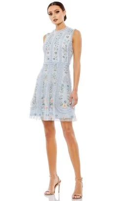 Start your night out right in style in this brilliantly detailed Mac Duggal 9135 creation. Opulently rendered with hand sewn floral embroidered details and accented with ruffled trims and sequin details, this dress parades with a sleeveless bodice and a jewel neckline. Flaunting a full back with a zipper closure, the textured skirt charms with a spectacle of blossoms as it flares into a short hemline. Be the delight of the crowd while making such a mesmerizing entrance in this Mac Duggal masterpiece. Models are wearing the Black and Powder Blue colors.