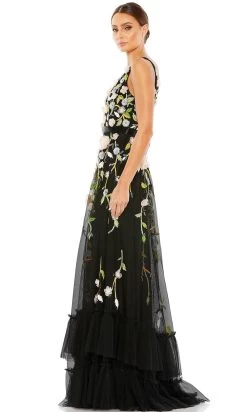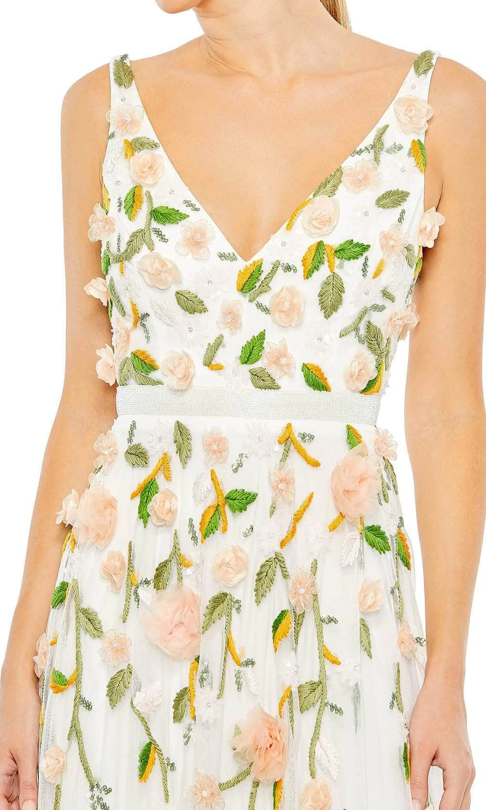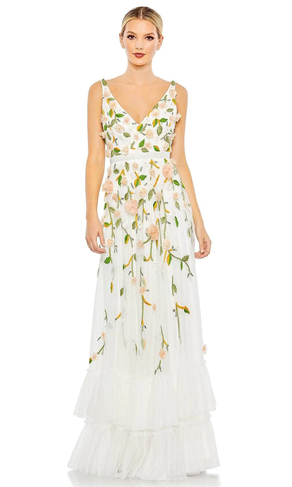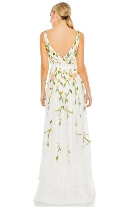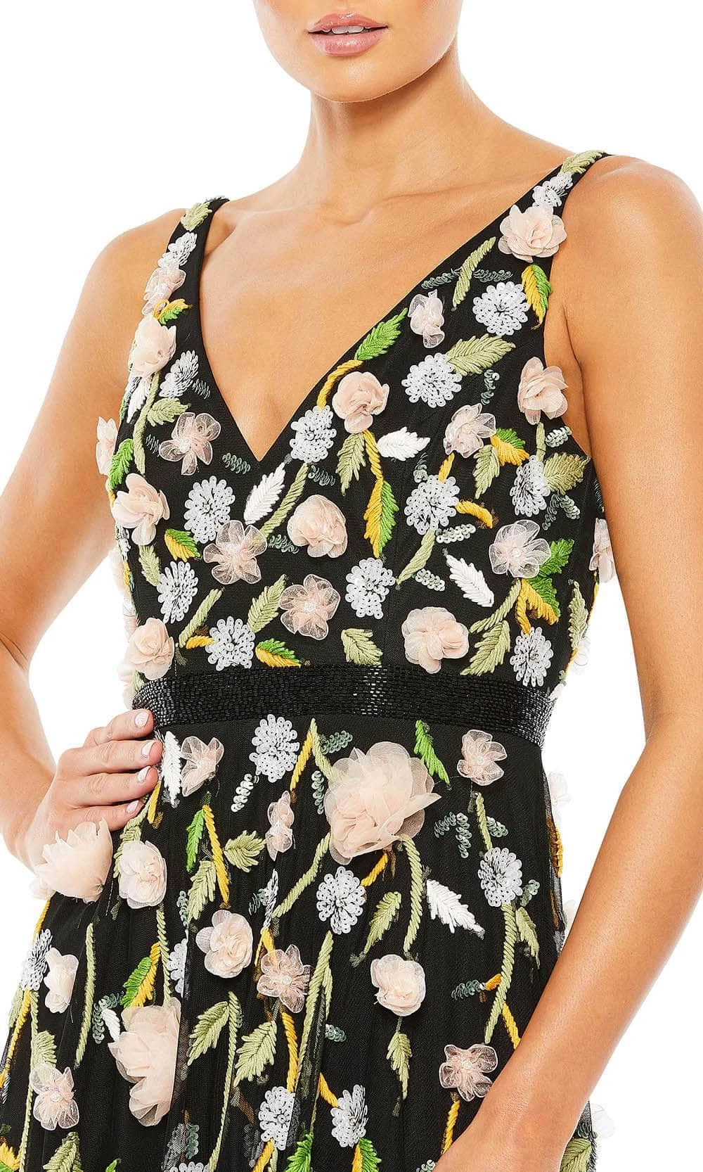 Bloom with loveliness in this floral evening gown from Mac Duggal 9171. The sleeveless bodice is decorated with 3D floral appliques, sequins and embroidery in floral patterns. It displays a V neckline, open V-back and beaded waistband. The skirt is styled with a two-tiered ruffled hem and it flares into a full length A-line silhouette. You’ll look fantastic in photos with a beautiful creation from Mac Duggal. Models are wearing the Black/Peach and White Multi colors.