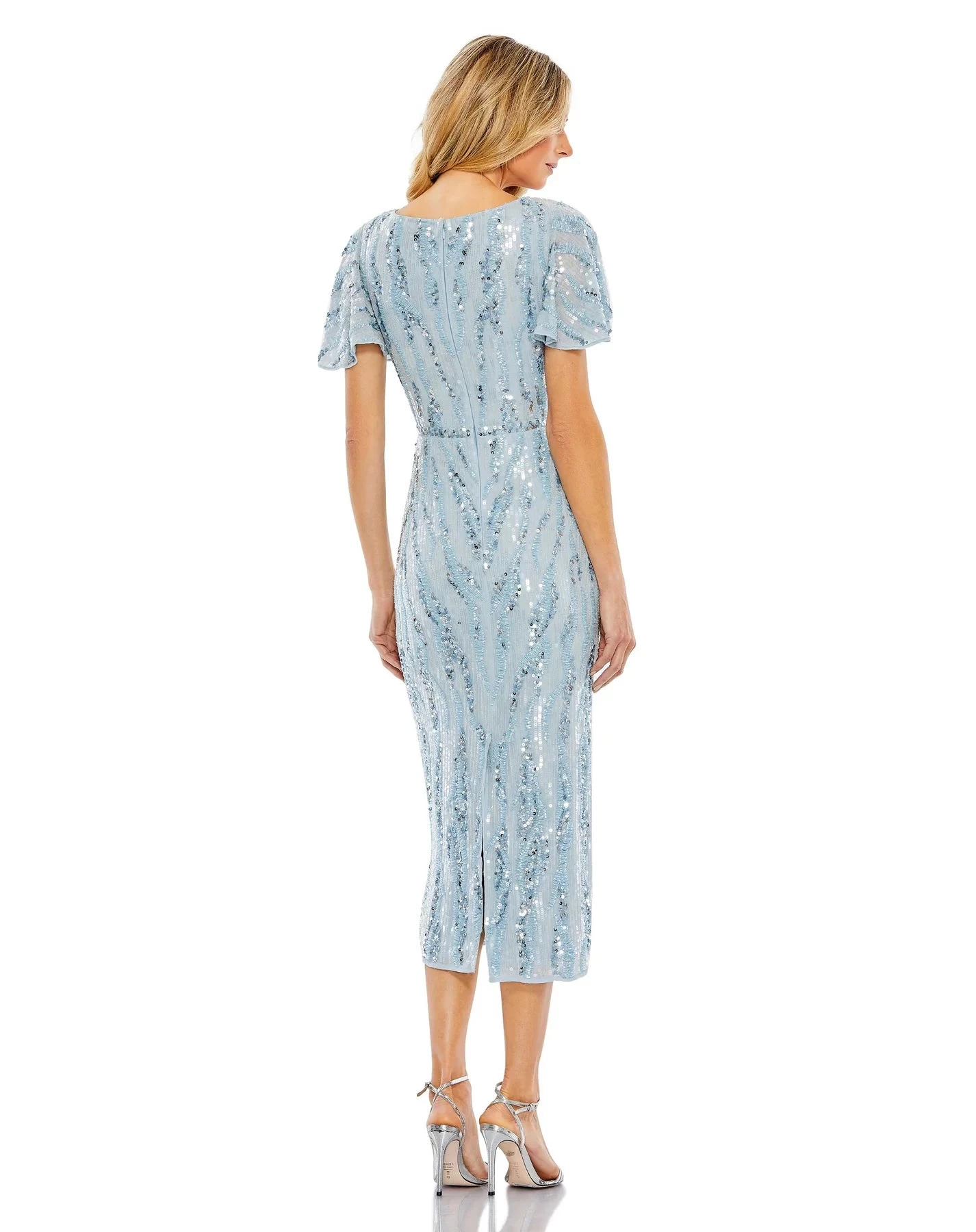 Lavish in the exquisite style and timeless appeal of this mesmerizingly feminine Mac Duggal 93591 creation. Elaborately embellished with sequins and beadwork, this dress flaunts a wide V-neckline with short flounce sleeves. The back has a full design with a zipper closure. The sheath skirt skims to a tea length hem with a small back slit. Deck yourself out with unparalleled flair as you don a style that is immaculately regal in this Mac Duggal masterpiece. Model is wearing Oyster color.